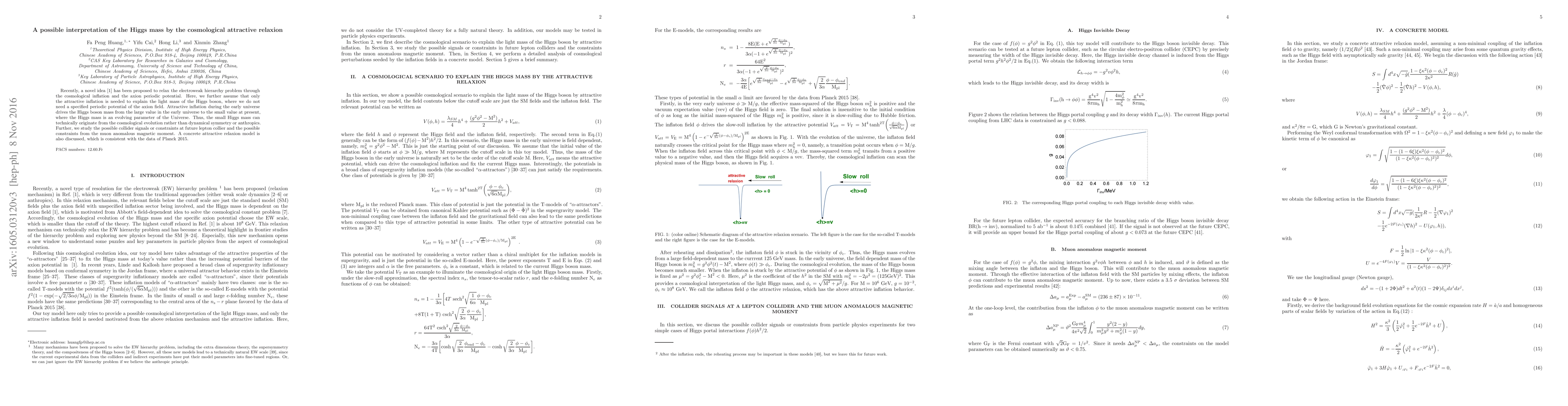 This paper proposes a cosmological attractive relaxion model to explain the light Higgs mass without relying on a specified axion potential, suggesting that the Higgs mass evolved from a large value in the early universe to its current small value through attractive inflation. It also discusses potential collider signals and constraints from the muon anomalous magnetic moment, and presents a model consistent with Planck 2015 data.