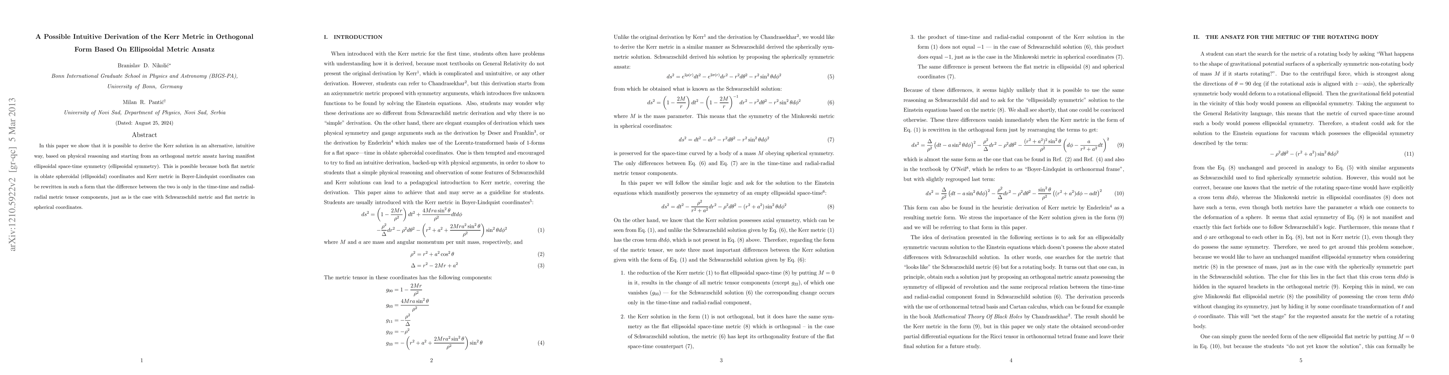 In this paper we show that it is possible to derive the Kerr solution in an alternative, intuitive way, based on physical reasoning and starting from an orthogonal metric ansatz having manifest ellipsoidal space-time symmetry (ellipsoidal symmetry). This is possible because both flat metric in oblate spheroidal (ellipsoidal) coordinates and Kerr metric in Boyer-Lindquist coordinates can be rewritten in such a form that the difference between the two is only in the time-time and radial-radial metric tensor components, just as is the case with Schwarzschild metric and flat metric in spherical coordinates.