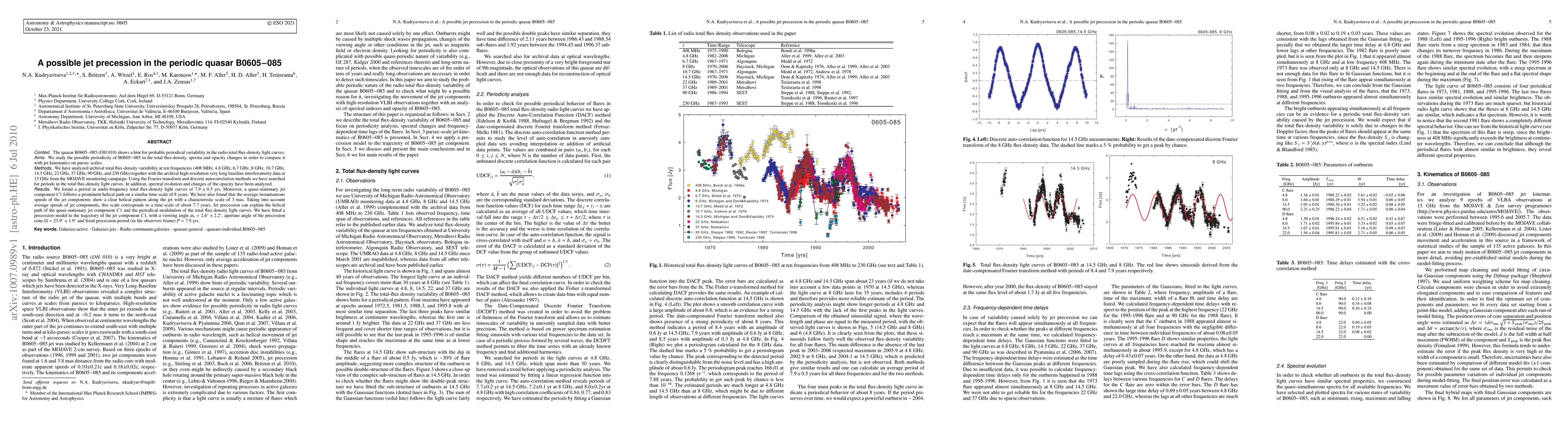 The quasar B0605-085 (OH 010) shows a hint for probable periodical variability in the radio total flux-density light curves. We study the possible periodicity of B0605-085 in the total flux-density, spectra and opacity changes in order to compare it with jet kinematics on parsec scales. We have analyzed archival total flux-density variability at ten frequencies (408 MHz, 4.8 GHz, 6.7 GHz, 8 GHz, 10.7 GHz, 14.5 GHz, 22 GHz, 37 GHz, 90 GHz, and 230 GHz) together with the archival high-resolution very long baseline interferometry data at 15 GHz from the MOJAVE monitoring campaign. Using the Fourier transform and discrete autocorrelation methods we have searched for periods in the total flux-density light curves. In addition, spectral evolution and changes of the opacity have been analyzed. We found a period in multi-frequency total flux-density light curves of 7.9+-0.5 yrs. Moreover, a quasi-stationary jet component C1 follows a prominent helical path on a similar time scale of 8 years. We have also found that the average instantaneous speeds of the jet components show a clear helical pattern along the jet with a characteristic scale of 3 mas. Taking into account average speeds of jet components, this scale corresponds to a time scale of about 7.7 years. Jet precession can explain the helical path of the quasi-stationary jet component C1 and the periodical modulation of the total flux-density light curves. We have fitted a precession model to the trajectory of the jet component C1, with a viewing angle phi=2.6+-2.2 degrees, aperture angle of the precession cone Omega=23.9+-1.9 degrees and fixed precession period (in the observers frame) P = 7.9 yrs.