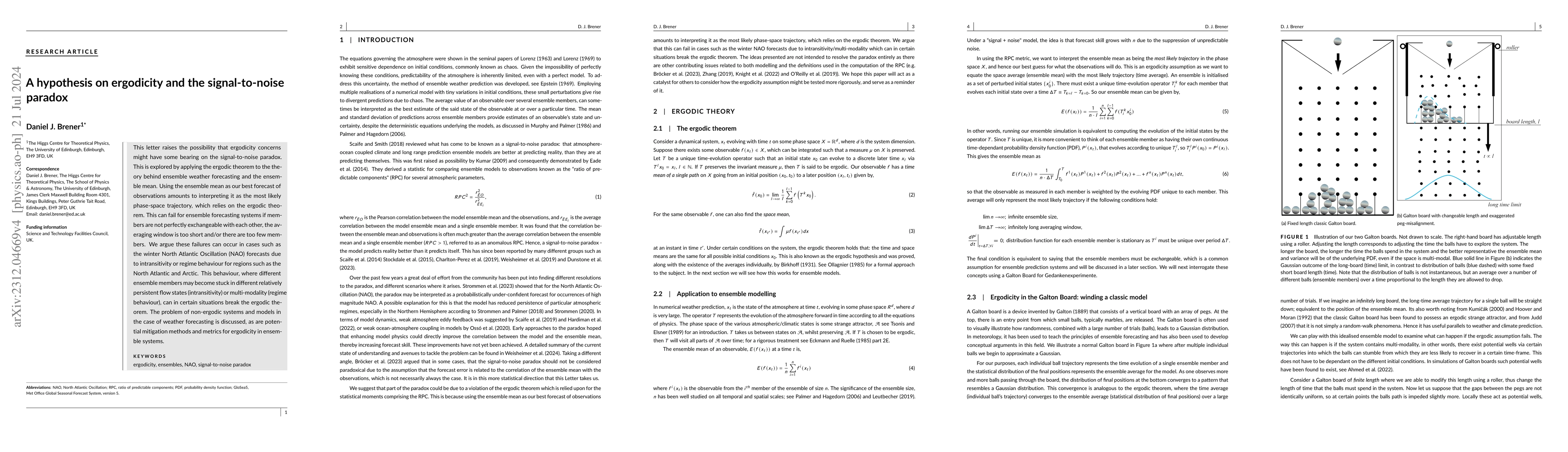 This paper explores a potential link between ergodicity and the signal-to-noise paradox, suggesting that non-ergodic behavior in ensemble weather forecasting can break the ergodic theorem. It discusses regime behavior and multi-modality in regions like the North Atlantic and Arctic, proposing mitigation methods for non-ergodic systems.