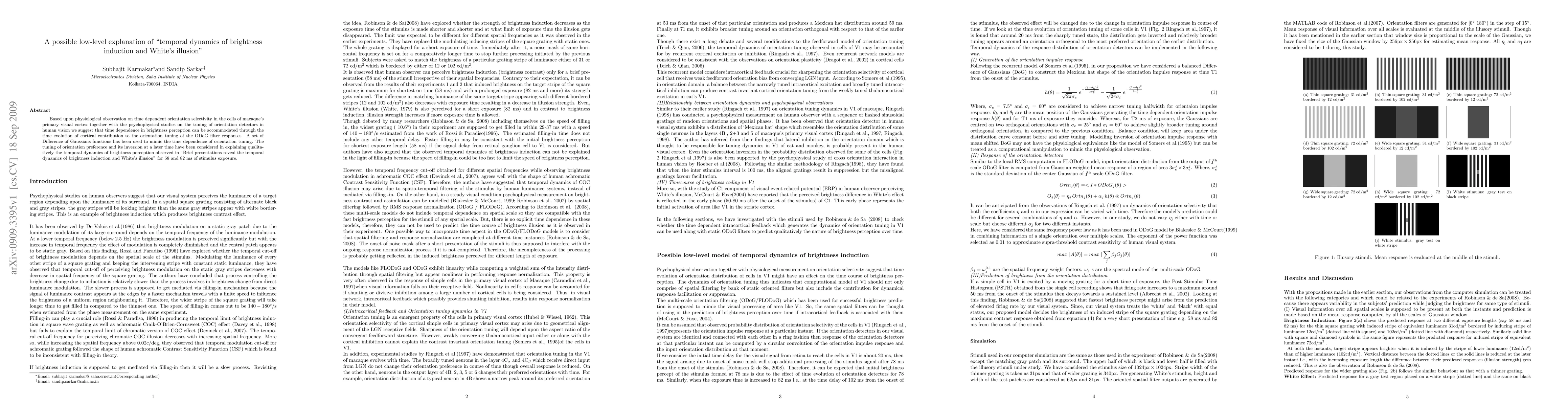 This research proposes a low-level physiological explanation for the temporal dynamics of brightness induction and White's illusion, suggesting that time-dependent orientation selectivity in macaque visual cortex and human psychophysics can be modeled using Difference of Gaussians filters. The study explains orientation preference inversion over time to account for observed brightness perception changes at specific stimulus durations.