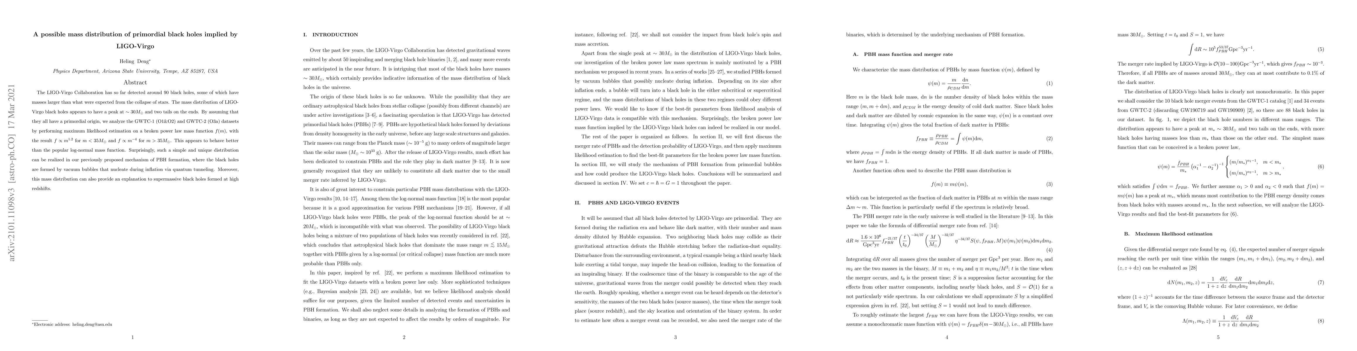 The LIGO-Virgo Collaboration detected black holes with unexpected masses, suggesting a mass distribution peak at 30 solar masses and heavy tails. Analysis of the GWTC-1 and GWTC-2 datasets reveals a broken power law mass function that fits better than the log-normal function, potentially explaining the formation of primordial black holes via vacuum bubbles during inflation.