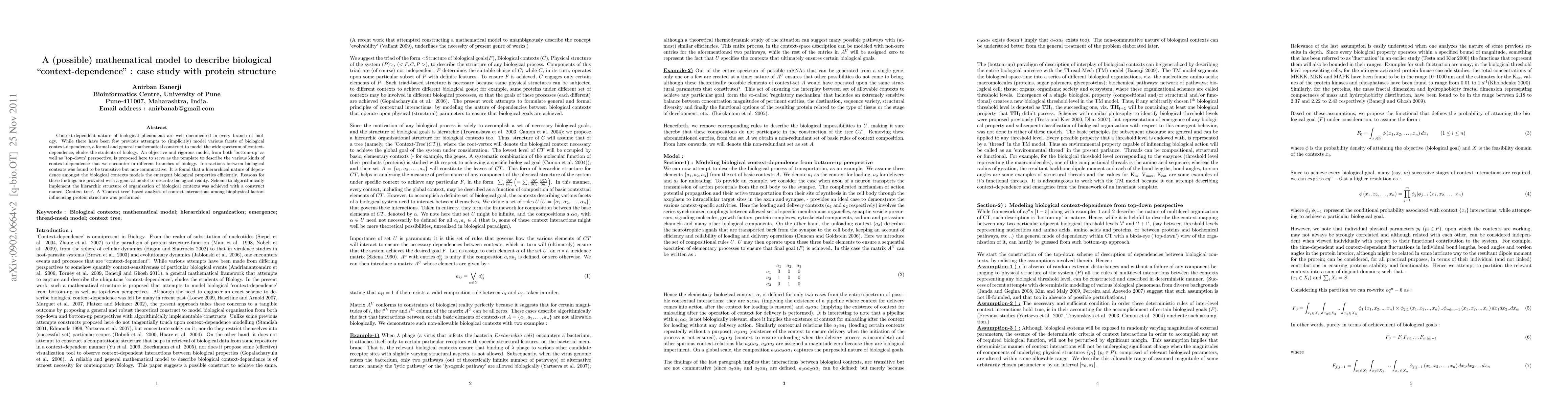 Context-dependent nature of biological phenomena are well documented in every branch of biology. While there have been few previous attempts to (implicitly) model various facets of biological context-dependence, a formal and general mathematical construct to model the wide spectrum of context-dependence, eludes the students of biology. An objective and rigorous model, from both 'bottom-up' as well as 'top-down' perspective, is proposed here to serve as the template to describe the various kinds of context-dependence that we encounter in different branches of biology. Interactions between biological contexts was found to be transitive but non-commutative. It is found that a hierarchical nature of dependence amongst the biological contexts models the emergent biological properties efficiently. Reasons for these findings are provided with a general model to describe biological reality. Scheme to algorithmically implement the hierarchic structure of organization of biological contexts was achieved with a construct named 'Context tree'. A 'Context tree' based analysis of context interactions among biophysical factors influencing protein structure was performed.