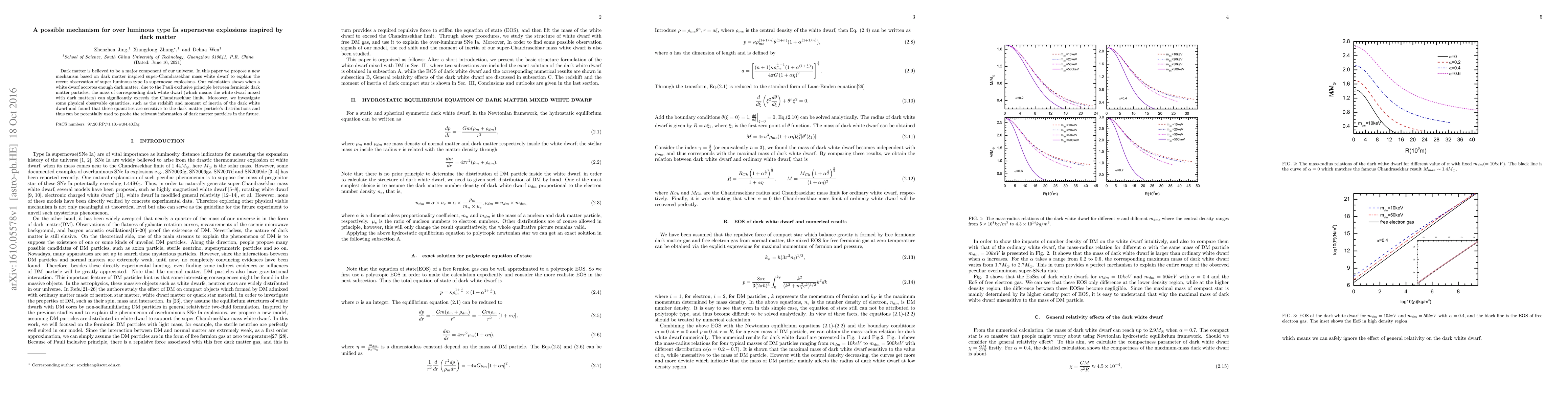 Dark matter is believed to be a major component of our universe. In this paper we propose a new mechanism based on dark matter inspired super-Chandrasekhar mass white dwarf to explain the recent observation of super luminous type Ia supernovae explosions. Our calculation shows when a white dwarf accretes enough dark matter, due to the Pauli exclusive principle between fermionic dark matter particles, the mass of corresponding dark white dwarf (which means the white dwarf mixed with dark matters) can significantly exceeds the Chandrasekhar limit. Moreover, we investigate some physical observable quantities, such as the redshift and moment of inertia of the dark white dwarf and found that these quantities are sensitive to the dark matter particle's distributions and thus can be potentially used to probe the relevant information of dark matter particles in the future.