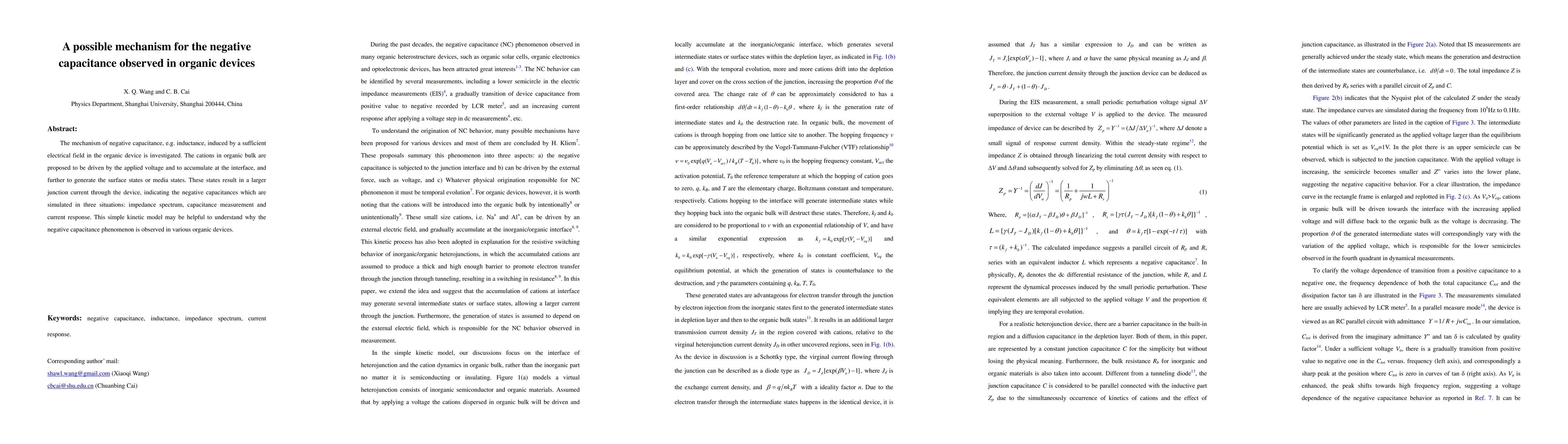 This paper investigates the mechanism behind negative capacitance in organic devices, proposing that cations driven by applied voltage accumulate at the interface, generating surface or media states that enhance junction current, thus exhibiting negative capacitance. Simulations across impedance spectrum, capacitance measurement, and current response support this kinetic model.