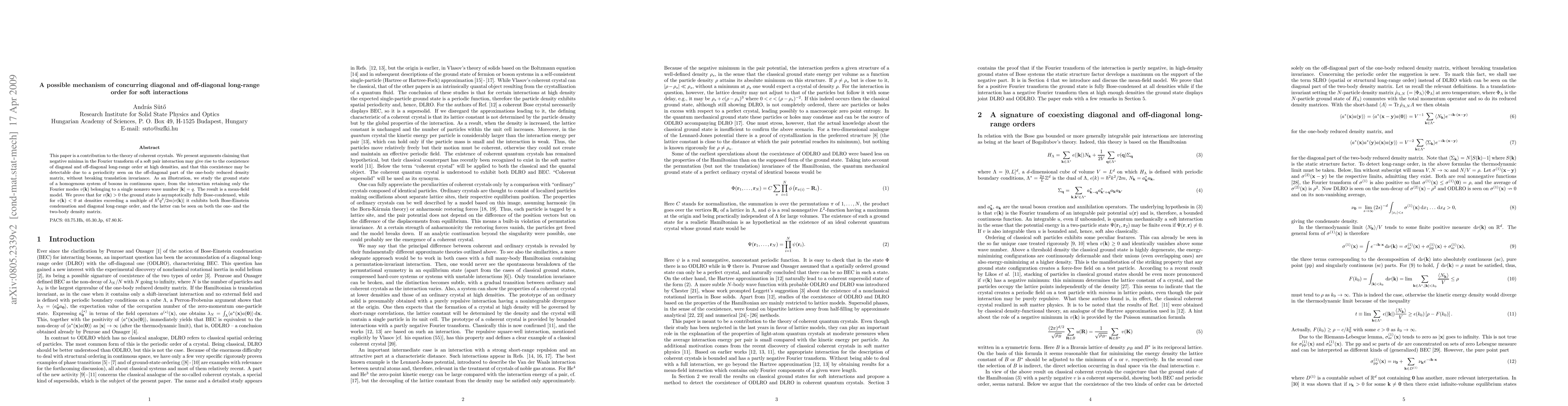 This paper is a contribution to the theory of coherent crystals. We present arguments claiming that negative minima in the Fourier transform of a soft pair interaction may give rise to the coexistence of diagonal and off-diagonal long-range order at high densities, and that this coexistence may be detectable due to a periodicity seen on the off-diagonal part of the one-body reduced density matrix, without breaking translation invariance. As an illustration, we study the ground state of a homogenous system of bosons in continuous space, from the interaction retaining only the Fourier modes $v(\k)$ belonging to a single nonzero wave number $|\k|=q$. The result is a mean-field model. We prove that for $v(\k)>0$ the ground state is asymptotically fully Bose-condensed, while for $v(\k)<0$ at densities exceeding a multiple of $\hbar^2 q^2/2m|v(\k)|$ it exhibits both Bose-Einstein condensation and diagonal long-range order, and the latter can be seen on both the one- and the two-body density matrix.