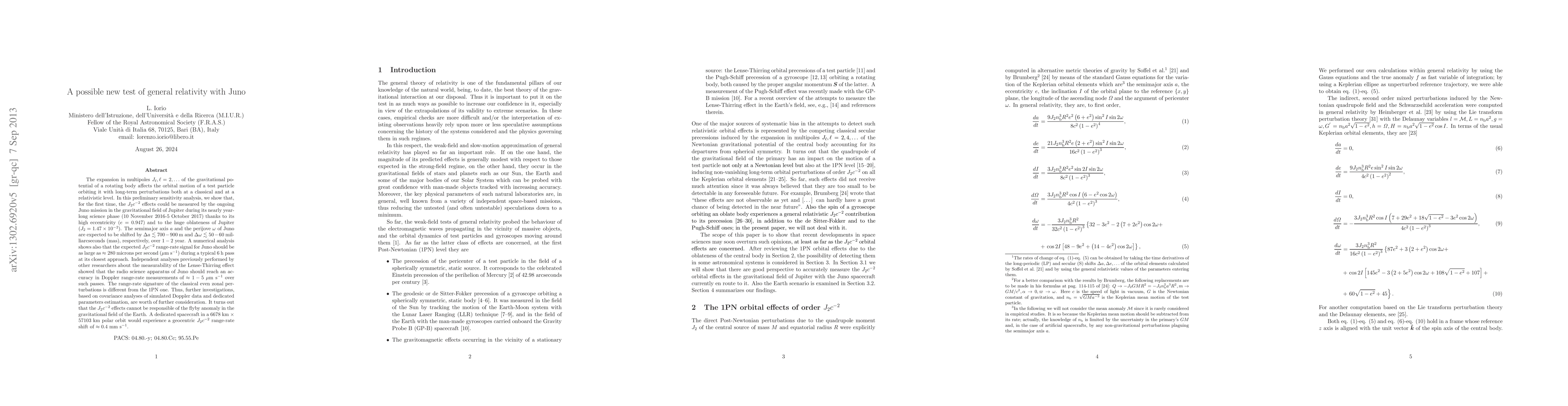 This research proposes using Juno's orbit around Jupiter to test general relativity by measuring Jupiter's quadrupole moment (J2) effects. The high eccentricity of Juno's orbit and Jupiter's large oblateness could enable detection of expected shifts in semi-major axis and perijove. The study suggests a range-rate signal of 280 microns/sec, which is larger than the required accuracy for detecting the Lense-Thirring effect. It also clarifies that J2 c^-2 effects are not responsible for the flyby anomaly around Earth.