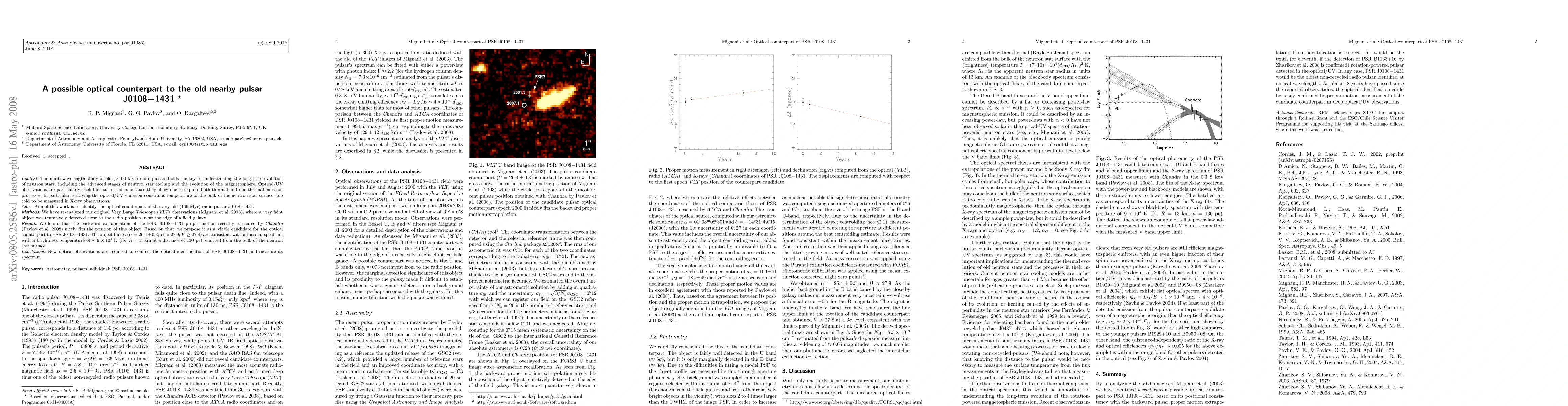The multi-wavelength study of old (>100 Myr) radio pulsars holds the key to understanding the long-term evolution of neutron stars, including the advanced stages of neutron star cooling and the evolution of the magnetosphere. Optical/UV observations are particularly useful for such studies because they allow one to explore both thermal and non-thermal emission processes. In particular, studying the optical/UV emission constrains temperature of the bulk of the neutron star surface, too cold to be measured in X-ray observations.Aim of this work is to identify the optical counterpart of the very old (166 Myr) radio pulsar J0108-1431. We have re-analyzed our original VLT observations (Mignani et al. 2003), where a very faint object was tentatively detected close to the radio position, near the edge of a field galaxy. We found that the backward extrapolation of the PSR J0108-1431 proper motion recently measured by CHANDRA(Pavlov et al. 2008) nicely fits the position of this object. Based on that, we propose it as a viable candidate for the optical counterpart to PSR J0108-1431. The object fluxes (U =26.4+/-0.3; B =27.9; V >27.8) are consistent with a thermal spectrum with a brightness temperature of 9X10^4 K (for R = 13 km at a distance of 130 pc), emitted from the bulk of the neutron star surface. New optical observations are required to confirm the optical identification of PSR J0108-1431 and measure its spectrum.
