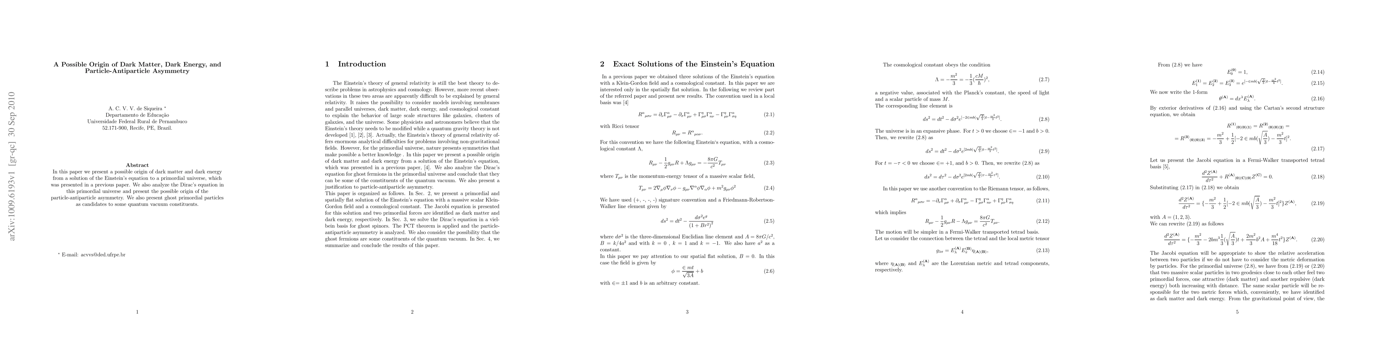 In this paper we present a possible origin of dark matter and dark energy from a solution of the Einstein's equation to a primordial universe, which was presented in a previous paper. We also analyze the Dirac's equation in this primordial universe and present the possible origin of the particle-antiparticle asymmetry. We also present ghost primordial particles as candidates to some quantum vacuum contituents.