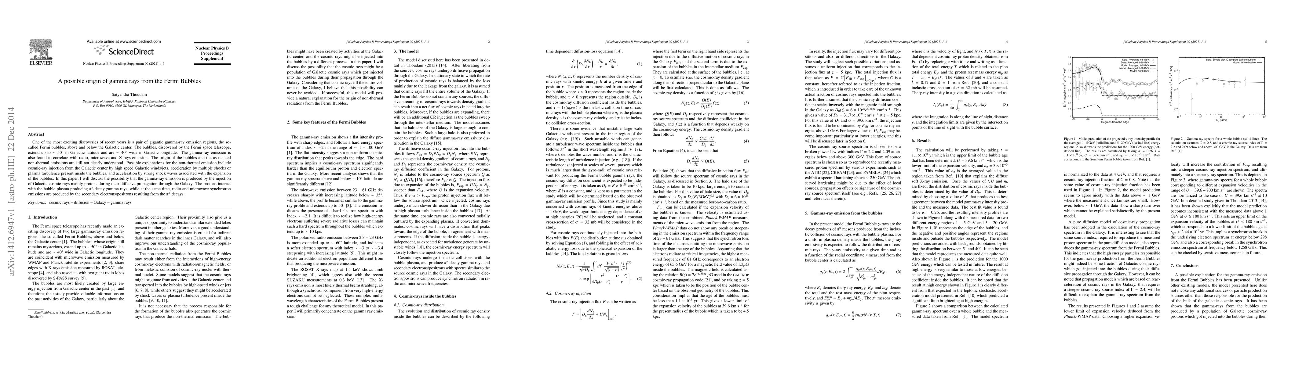 This paper explores the potential origin of gamma rays in the Fermi Bubbles, suggesting that cosmic-ray protons interacting with bubble plasma produce the observed gamma-ray emission via $\pi^\circ$-decay, while secondary electrons/positrons generate radio and microwave synchrotron emissions.