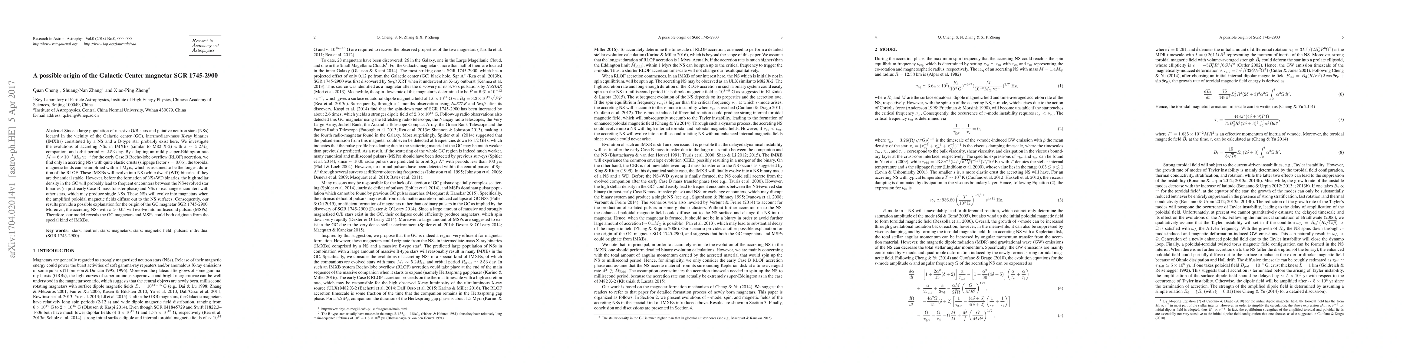 Since a large population of massive O/B stars and putative neutron stars (NSs) located in the vicinity of the Galactic center (GC), intermediate-mass X-ray binaries (IMXBs) constituted by a NS and a B-type star probably exist here. We investigate the evolutions of accreting NSs in IMXBs (similar to M82 X-2) with a $\sim5.2M_\odot$ companion, and orbit period $\simeq2.53$ day. By adopting an mildly super-Eddington rate $\dot{M}=6\times10^{-8}M_\odot~{\rm yr}^{-1}$ for the early Case B Roche-lobe overflow (RLOF) accretion, we find only in accreting NSs with quite elastic crusts (slippage factor $s=0.05$), the toroidal magnetic fields can be amplified within 1 Myrs, which is assumed to be the longest duration of the RLOF. These IMXBs will evolve into NS+white dwarf (WD) binaries if they are dynamical stable. However, before the formation of NS+WD binaries, the high stellar density in the GC will probably lead to frequent encounters between the NS+evolved star binaries (in post-early Case B mass transfer phase) and NSs or exchange encounters with other stars, which may produce single NSs. These NSs will evolve into magnetars when the amplified poloidal magnetic fields diffuse out to the NS surfaces. Consequently, our results provide a possible explanation for the origin of the GC magnetar SGR 1745-2900. Moreover, the accreting NSs with $s>0.05$ will evolve into millisecond pulsars (MSPs). Therefore, our model reveals the GC magnetars and MSPs could both originate from the special kind of IMXBs.