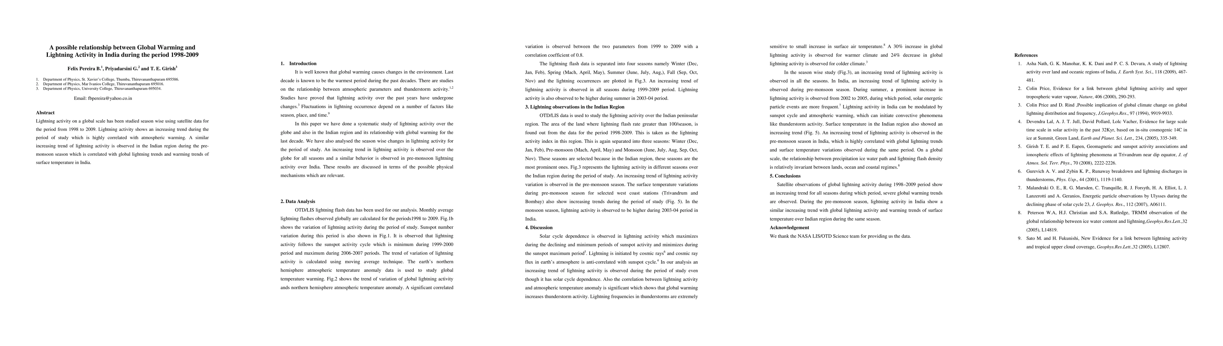 This study found a correlation between global warming and increasing lightning activity in India during the pre-monsoon season from 1998-2009. The trend is consistent with global lightning trends and surface temperature warming in India.