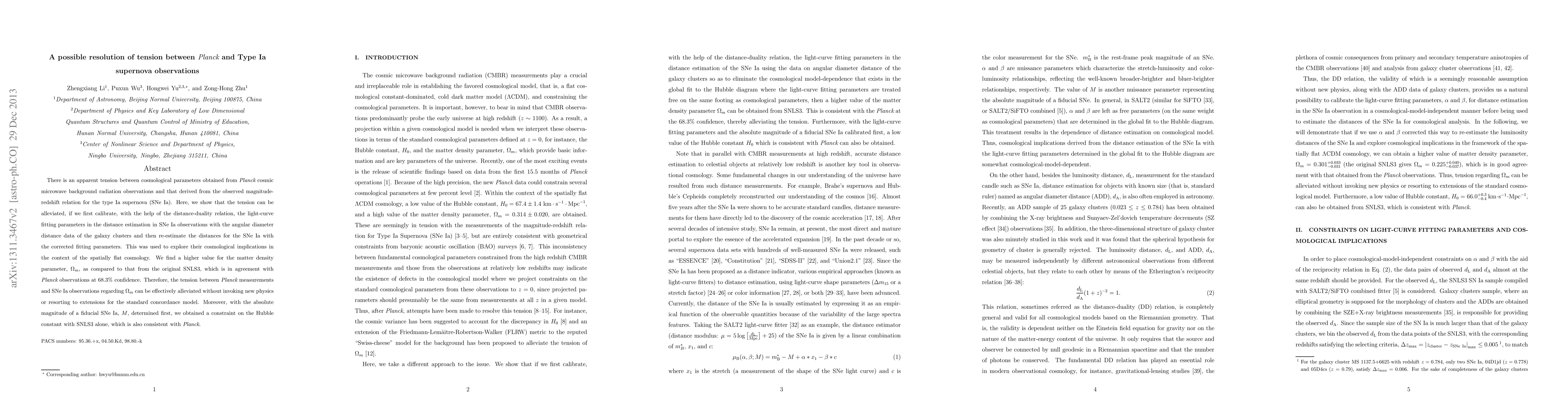 There is an apparent tension between cosmological parameters obtained from {\it Planck} cosmic microwave background radiation observations and that derived from the observed magnitude-redshift relation for the type Ia supernova (SNe Ia). Here, we show that the tension can be alleviated, if we first calibrate, with the help of the distance-duality relation, the light-curve fitting parameters in the distance estimation in SNe Ia observations with the angular diameter distance data of the galaxy clusters and then re-estimate the distances for the SNe Ia with the corrected fitting parameters. This was used to explore their cosmological implications in the context of the spatially flat cosmology. We find a higher value for the matter density parameter, $\Omega_m$, as compared to that from the original SNLS3, which is in agreement with {\it Planck} observations at $68.3\%$ confidence. Therefore, the tension between {\it Planck} measurements and SNe Ia observations regarding $\Omega_m$ can be effectively alleviated without invoking new physics or resorting to extensions for the standard concordance model. Moreover, with the absolute magnitude of a fiducial SNe Ia, $M$, determined first, we obtained a constraint on the Hubble constant with SNLS3 alone, which is also consistent with {\it Planck}.