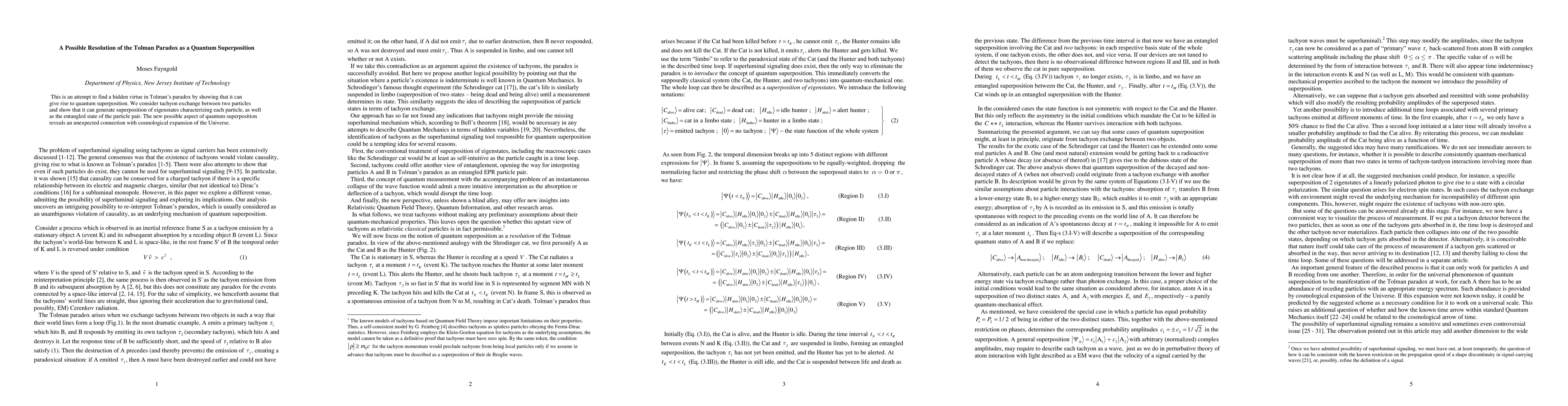 Researchers suggest that Tolman's paradox can lead to quantum superposition through tachyon exchange between particles, revealing an unexpected connection with the universe's cosmological expansion.