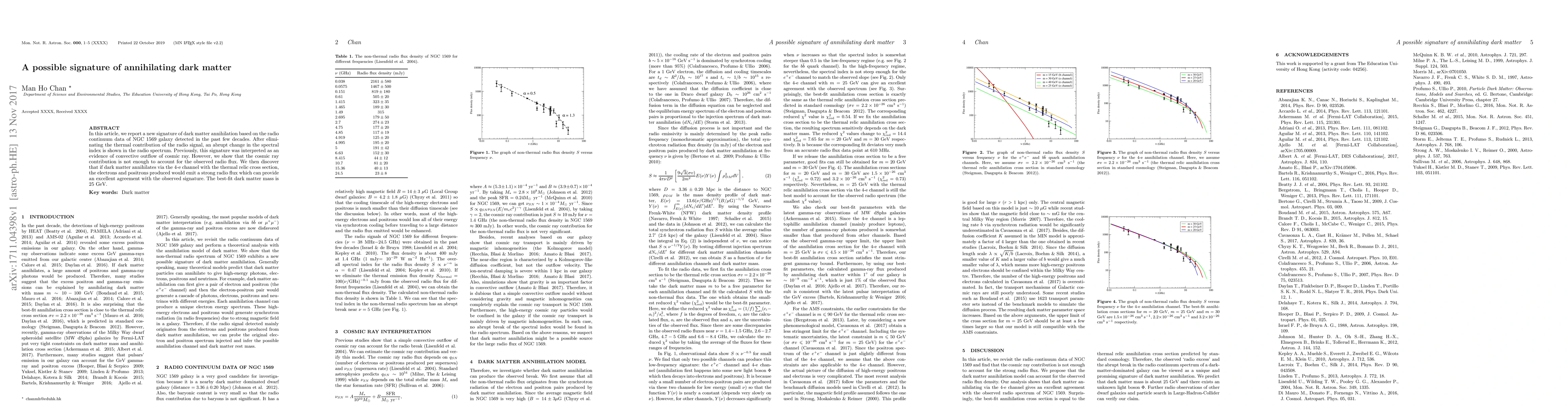 In this article, we report a new signature of dark matter annihilation based on the radio continuum data of NGC 1569 galaxy detected in the past few decades. After eliminating the thermal contribution of the radio signal, an abrupt change in the spectral index is shown in the radio spectrum. Previously, this signature was interpreted as an evidence of convective outflow of cosmic ray. However, we show that the cosmic ray contribution is not enough to account for the observed radio flux. We then discover that if dark matter annihilates via the 4-e channel with the thermal relic cross section, the electrons and positrons produced would emit a strong radio flux which can provide an excellent agreement with the observed signature. The best-fit dark matter mass is 25 GeV.