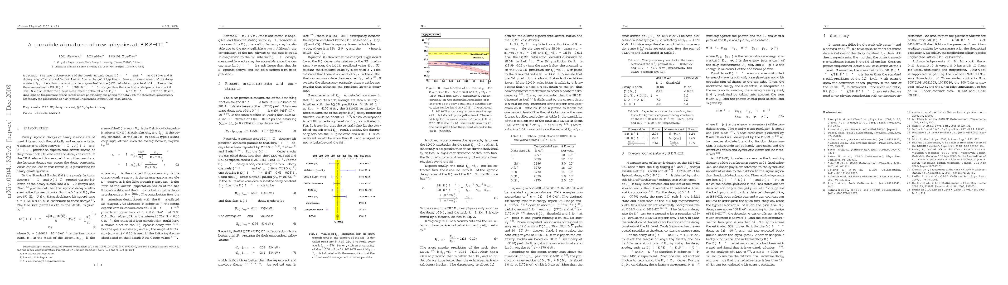 The recent observations of the purely leptonic decay $\Ds \to \mu^+ \nu_{\mu}$ and $\tau^+\nu_{\tau}$ at CLEO-c and $B$ factory may allow a possible contribution from a charged Higgs boson. One such measurement of the decay constant $f_{D_s}$ differs from the most precise unquenched lattice QCD calculation by 4 $\sigma$ level. Meanwhile, the measured ratio, ${\cal BR}(\Ds \to \mu^+ \nu_{\mu})$ / ${\cal BR}(\Dp \to \mu^+ \nu_{\mu})$, is larger than the standard model prediction at 2.0$\sigma$ level. We discuss that the precise measurement of the ratio ${\cal BR}(\Ds \to \mu^+ \nu_{\mu})$ / ${\cal BR}(\Dp \to \mu^+ \nu_{\mu})$ at BES-III will shed light on the presence of new intermediate particles by comparing the theoretical predictions, especially, the predictions of high precise unquenched lattice QCD calculation.