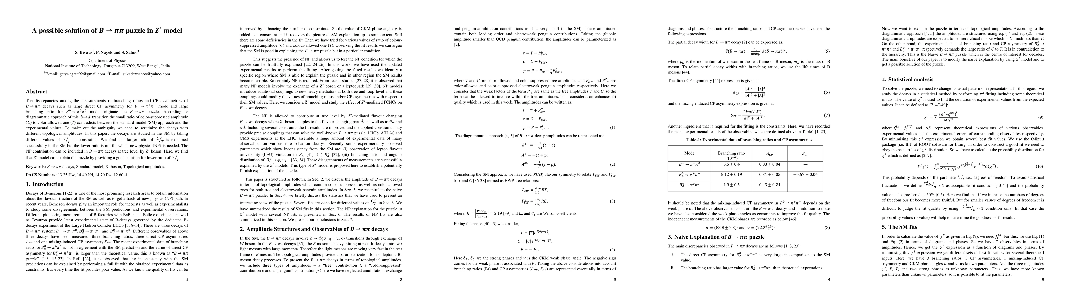 The discrepancies among the measurements of branching ratios and CP asymmetries of $B$ arrow ${\pi}{\pi}$ decays such as large direct CP asymmetry for $B^0 $ arrow ${\pi}^+ {\pi}^-$ mode and large branching ratio for $B^0$ arrow ${\pi}^0 {\pi}^0$ mode originate the $B$ arrow ${\pi}{\pi}$ puzzle. According to diagrammatic approach of this $b$ arrow $d$ transition the small ratio of color-suppressed amplitude (C) to color-allowed one (T) contradicts between the standard model (SM) approach and the experimental values. To make out the ambiguity we need to scrutinize the decays with different topological amplitudes. In this paper, the decays are studied in the SM by taking different values of C/T as constraints. We find that larger ratio of C/T is explained successfully in the SM but the lower ratio is not for which new physics (NP) is needed. The NP contribution can be included in $B$ arrow ${\pi}{\pi}$ decays at tree level by Z' boson. Here, we find that Z' model can explain the puzzle by providing a good solution for lower ratio of C/T.
