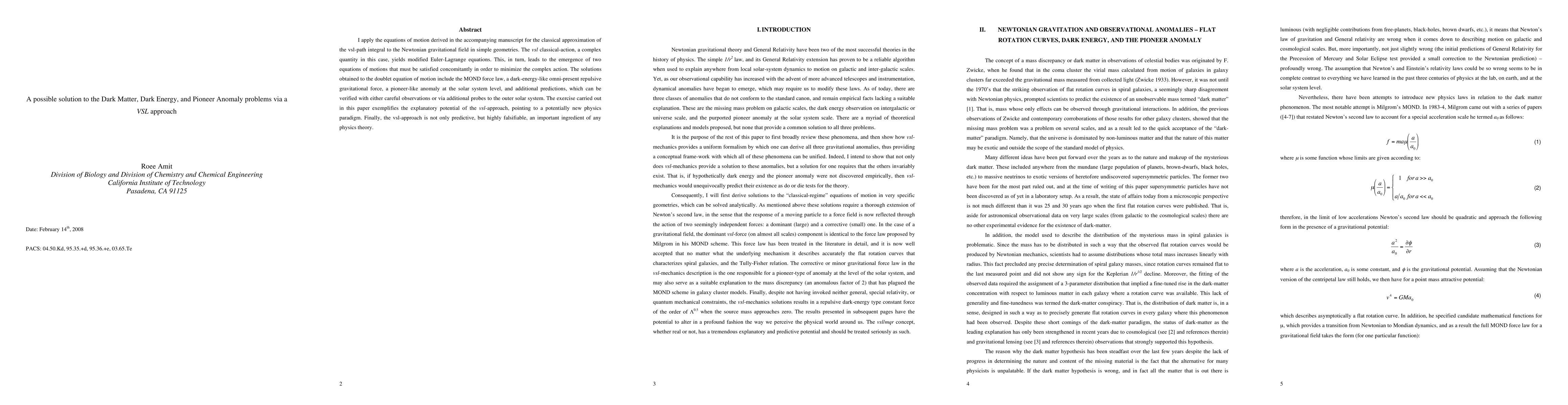 I apply the equations of motion derived in the accompanying manuscript for the classical approximation of the vsl-path integral to the Newtonian gravitational field in simple geometries. The vsl classical-action, a complex quantity in this case, yields modified Euler-Lagrange equations. This, in turn, leads to the emergence of two equations of motions that must be satisfied concomitantly in order to minimize the complex action. The solutions obtained to the doublet equation of motion include the MOND force law, a dark-energy-like omni-present repulsive gravitational force, a pioneer-like anomaly at the solar system level, and additional predictions, which can be verified with either careful observations or via additional probes to the outer solar system. The exercise carried out in this paper exemplifies the explanatory potential of the vsl-approach, pointing to a potentially new physics paradigm. Finally, the vsl-approach is not only predictive, but highly falsifiable, an important ingredient of any physics theory.
