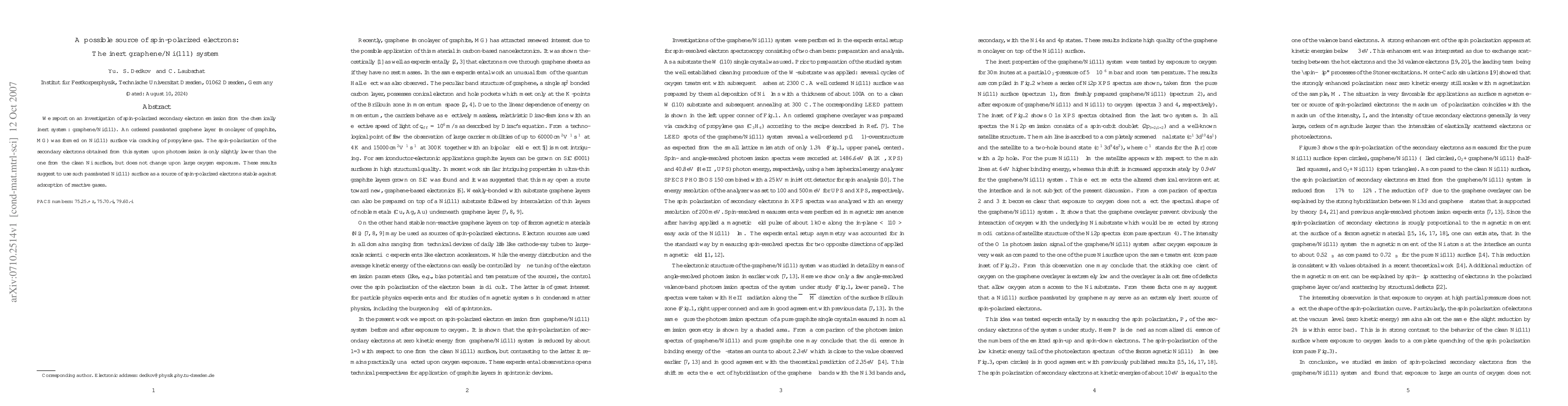 This study investigates spin-polarized secondary electron emission from inert graphene/Ni(111) system, revealing high spin-polarization comparable to clean Ni(111) that remains stable under oxygen exposure, indicating potential use as a reliable spin-polarized electron source.
