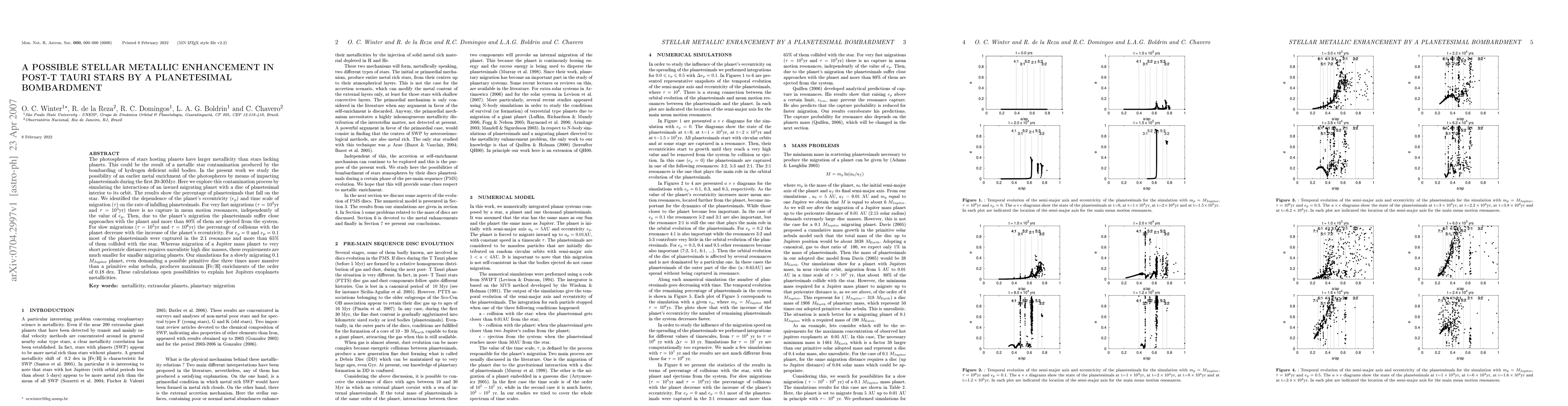 The photospheres of stars hosting planets have larger metallicity than stars lacking planets. In the present work we study the possibility of an earlier metal enrichment of the photospheres by means of impacting planetesimals during the first 20-30Myr. Here we explore this contamination process by simulating the interactions of an inward migrating planet with a disc of planetesimal interior to its orbit. The results show the percentage of planetesimals that fall on the star. We identified the dependence of the planet's eccentricity ($e_p$) and time scale of migration ($\tau$) on the rate of infalling planetesimals. For very fast migrations ($\tau=10^2$yr and $\tau=10^3$yr) there is no capture in mean motion resonances, independently of the value of $e_p$. Then, due to the planet's migration the planetesimals suffer close approaches with the planet and more than 80% of them are ejected from the system. For slow migrations ($\tau=10^5$yr and $\tau=10^6$yr) the percentage of collisions with the planet decrease with the increase of the planet's eccentricity. For $e_p=0$ and $e_p=0.1$ most of the planetesimals were captured in the 2:1 resonance and more than 65% of them collided with the star. Whereas migration of a Jupiter mass planet to very short pericentric distances requires unrealistic high disc masses, these requirements are much smaller for smaller migrating planets. Our simulations for a slowly migrating 0.1 $M_{\rm Jupiter}$ planet, even demanding a possible primitive disc three times more massive than a primitive solar nebula, produces maximum [Fe/H] enrichments of the order of 0.18 dex. These calculations open possibilities to explain hot Jupiters exoplanets metallicities.