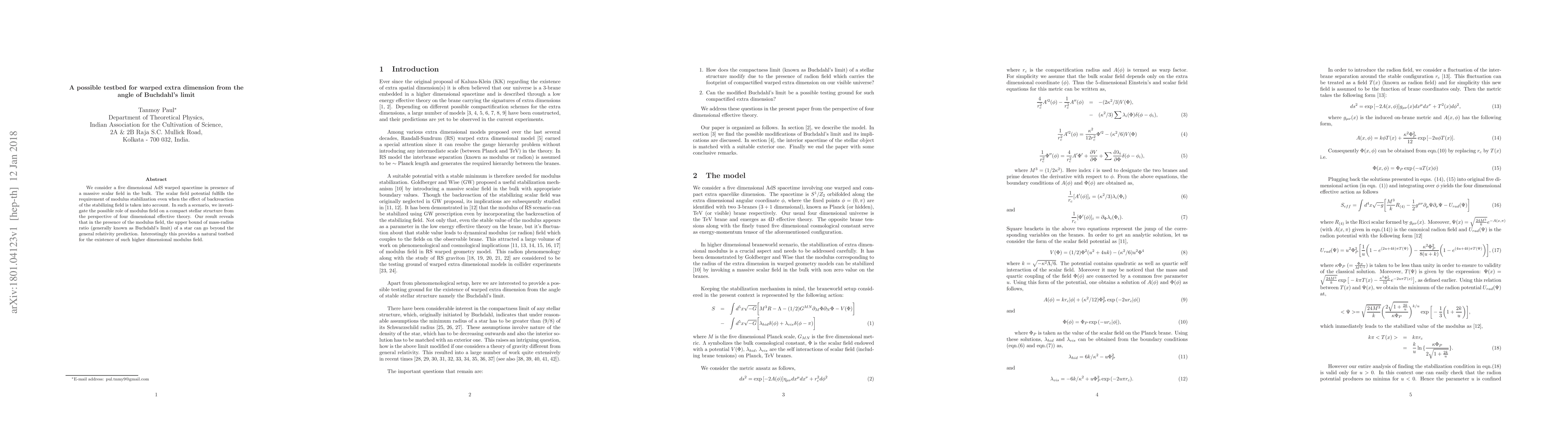 We consider a five dimensional AdS warped spacetime in presence of a massive scalar field in the bulk. The scalar field potential fulfills the requirement of modulus stabilization even when the effect of backreaction of the stabilizing field is taken into account. In such a scenario, we investigate the possible role of modulus field on a compact stellar structure from the perspective of four dimensional effective theory. Our result reveals that in the presence of the modulus field, the upper bound of mass-radius ratio (generally known as Buchdahl's limit) of a star can go beyond the general relativity prediction. Interestingly this provides a natural testbed for the existence of such higher dimensional modulus field.