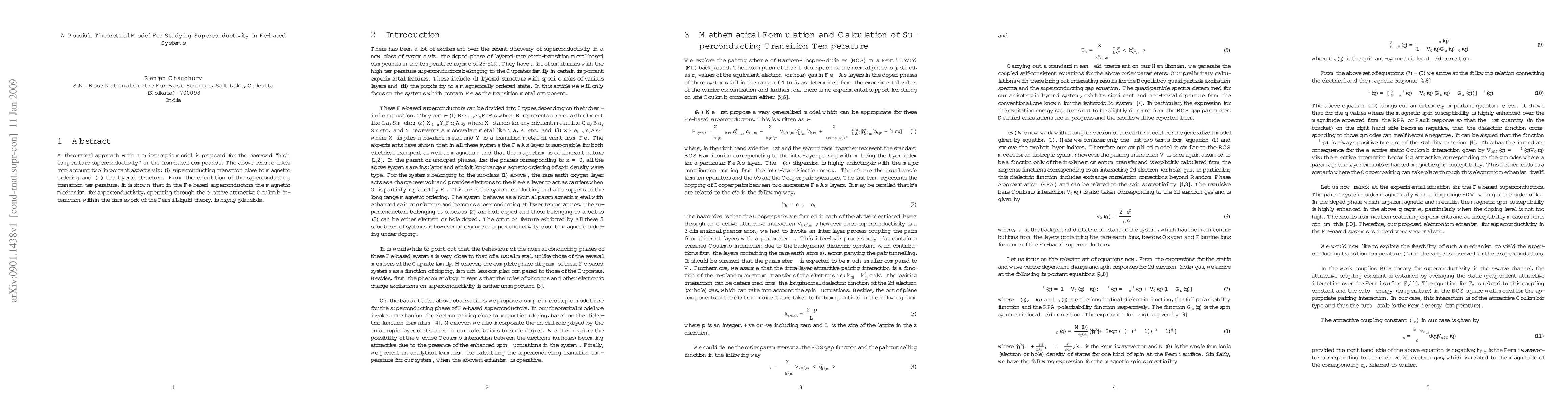A theoretical approach with a microscopic model is proposed for the observed "high temperature superconductivity" in the Iron-based compounds. The above scheme takes into account two important aspects viz. (i) superconducting transition close to magnetic ordering and (ii) the layered structure. From the calculation of the superconducting transition temperature, it is shown that in the Fe-based superconductors the magnetic mechanism for superconductivity, operating through the effective attractive Coulomb interaction within the framework of the Fermi Liquid theory, is highly plausible.