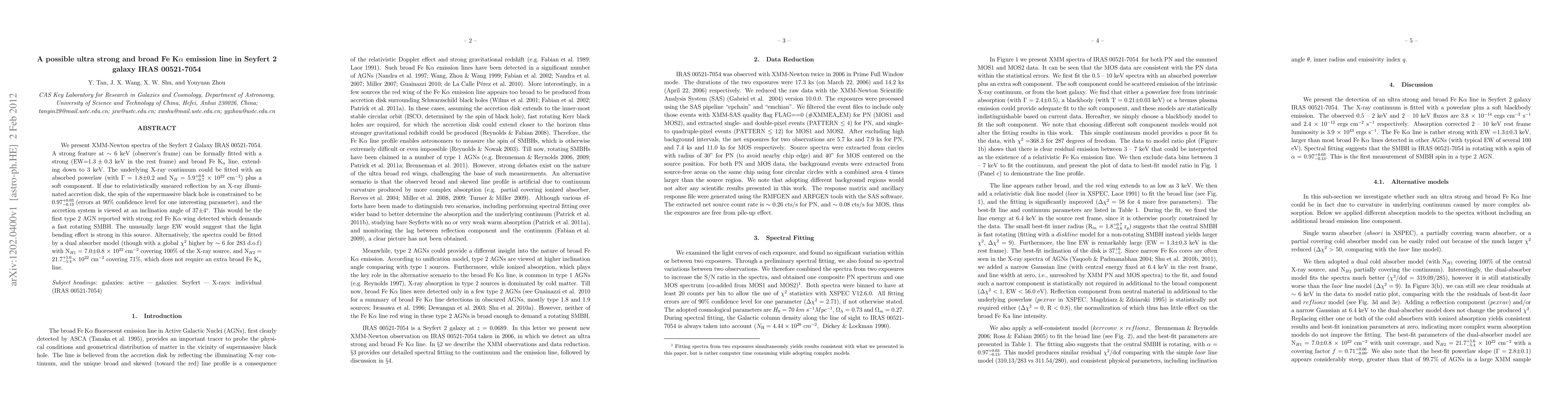 The XMM-Newton spectra analysis of Seyfert 2 galaxy IRAS 00521-7054 reveals a strong, broad Fe Ka emission line at ~6 keV, suggesting a fast-rotating supermassive black hole (spin 0.97) and strong light bending effects. Alternatively, the spectrum could also fit a dual absorber model without the broad Fe Ka line.