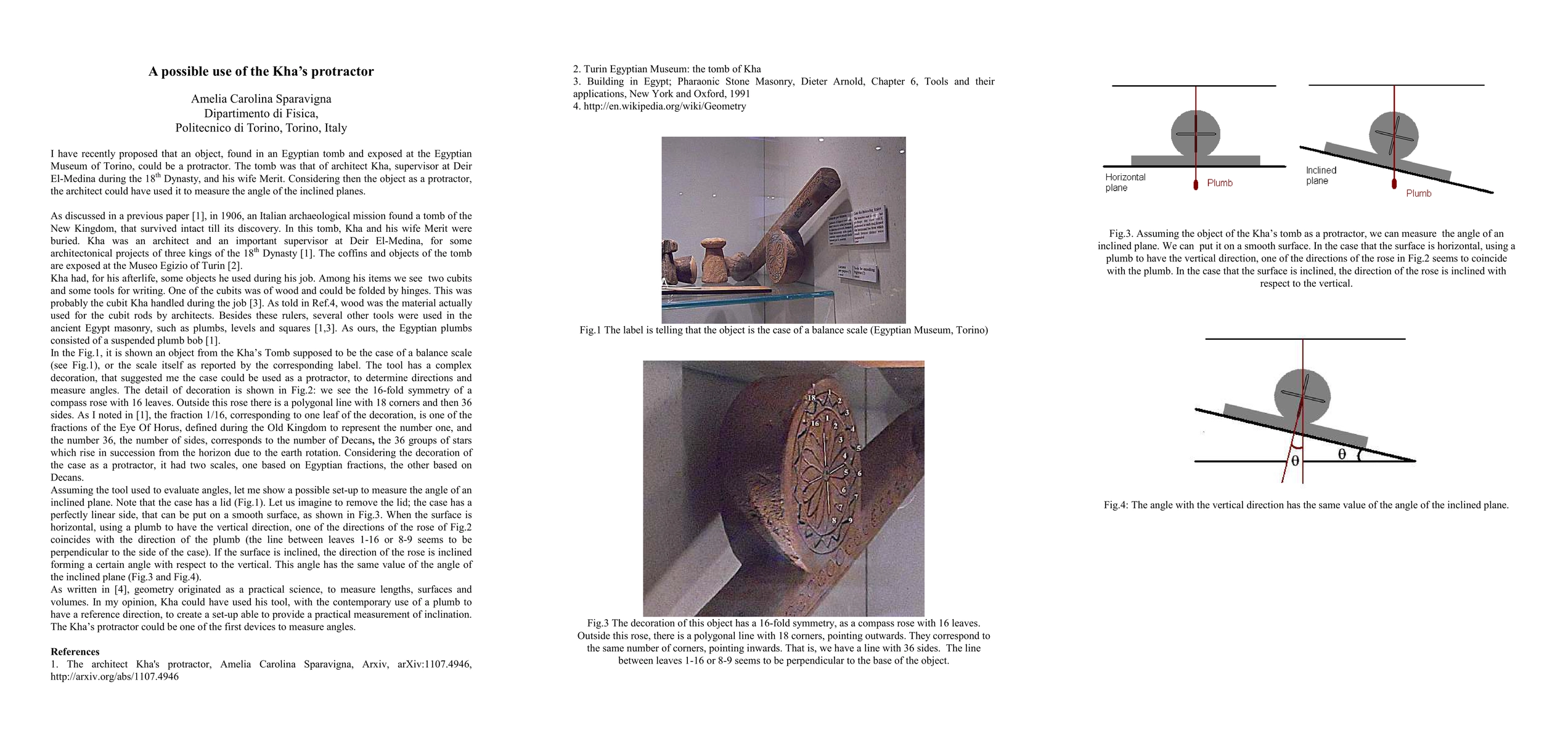 I have recently proposed that an object, found in an Egyptian tomb and exposed at the Egyptian Museum of Torino, could be a protractor. The tomb was that of architect Kha, supervisor at Deir El-Medina during the 18th Dynasty, and his wife Merit. Considering then the object as a protractor, the architect could have used it to measure the angle of the inclined planes.