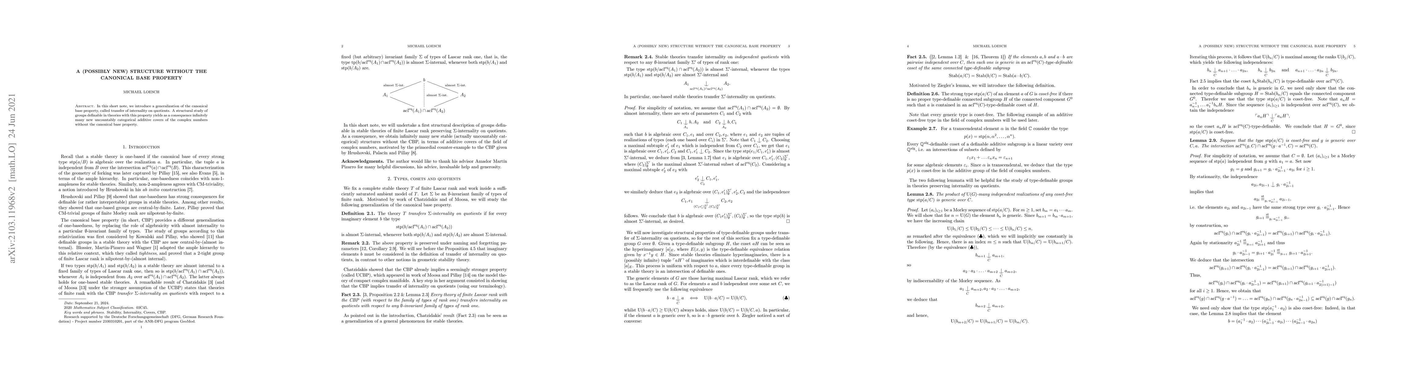 In this short note, we introduce a generalization of the canonical base property, called transfer of internality on quotients. A structural study of groups definable in theories with this property yields as a consequence infinitely many new uncountably categorical additive covers of the complex numbers without the canonical base property.