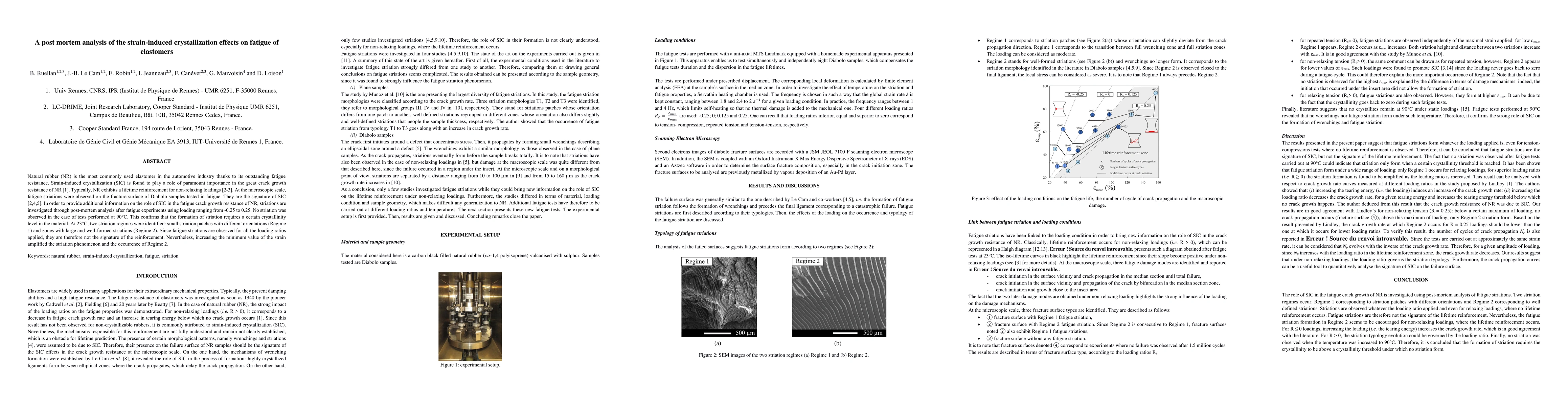 Natural rubber (NR) is the most commonly used elastomer in the automotive industry thanks to its outstanding fatigue resistance. Strain-induced crystallization (SIC) is found to play a role of paramount importance in the great crack growth resistance of NR [1]. Typically, NR exhibits a lifetime reinforcement for non-relaxing loadings [2-3]. At the microscopic scale, fatigue striations were observed on the fracture surface of Diabolo samples tested in fatigue. They are the signature of SIC [2,4,5]. In order to provide additional information on the role of SIC in the fatigue crack growth resistance of NR, striations are investigated through post-mortem analysis after fatigue experiments using loading ranging from-0.25 to 0.25. No striation was observed in the case of tests performed at 90{\textdegree}C. This confirms that the formation of striation requires a certain crystallinity level in the material. At 23{\textdegree}C, two striation regimes were identified: small striation patches with different orientations (Regime 1) and zones with large and well-formed striations (Regime 2). Since fatigue striations are observed for all the loading ratios applied, they are therefore not the signature of the reinforcement. Nevertheless, increasing the minimum value of the strain amplified the striation phenomenon and the occurrence of Regime 2.