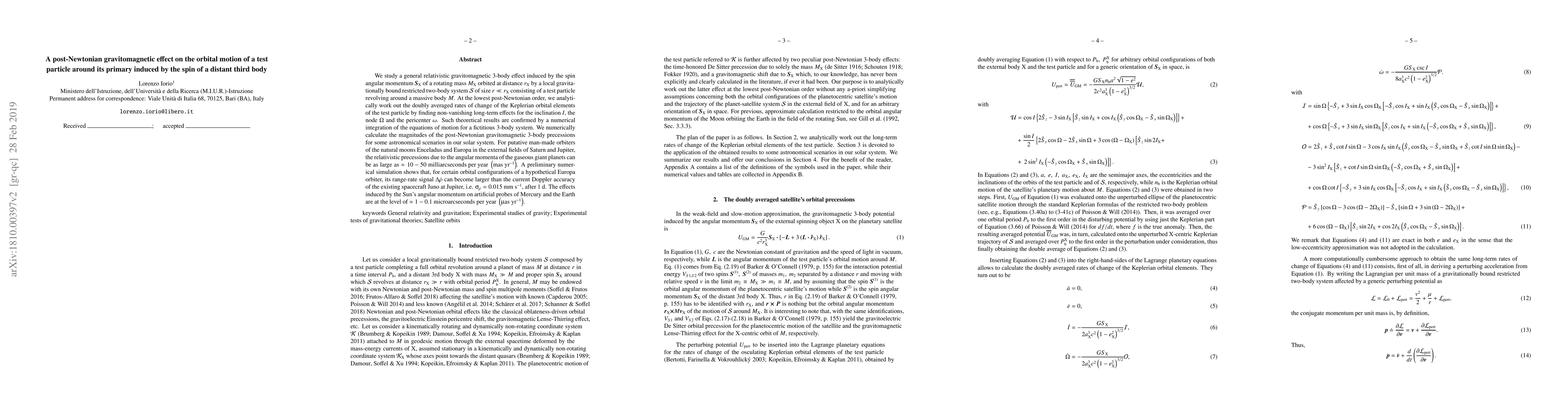 This paper investigates a post-Newtonian gravitomagnetic effect on the orbital motion of a test particle due to the spin of a distant third body, finding non-vanishing long-term changes in orbital elements. Numerical simulations confirm these effects, revealing significant precessions in hypothetical orbiters around moons Enceladus and Europa.