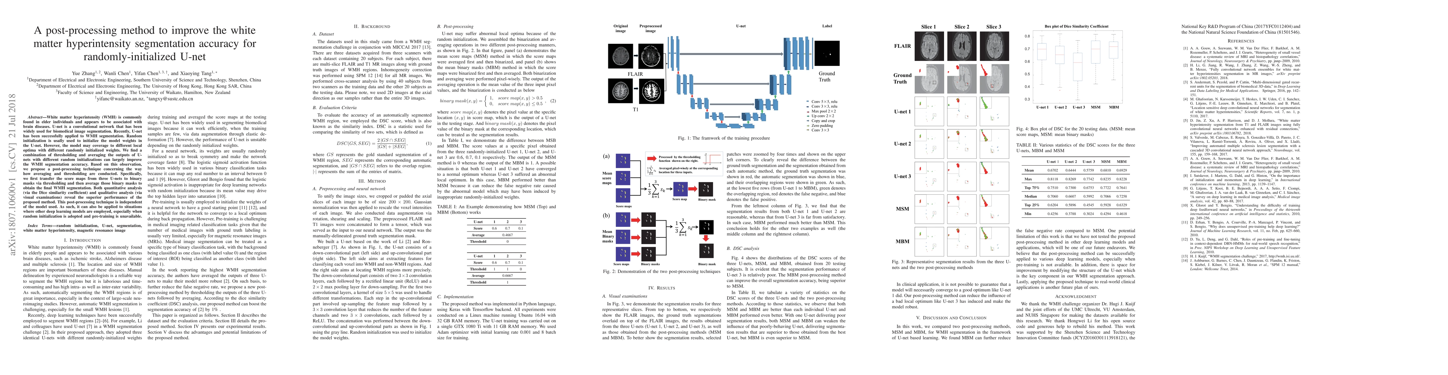 This paper proposes a post-processing method to improve the accuracy of white matter hyperintensity segmentation using randomly-initialized U-nets. By averaging the outputs of multiple U-nets and applying thresholding, the method significantly enhances segmentation accuracy, as demonstrated through quantitative and qualitative analyses.