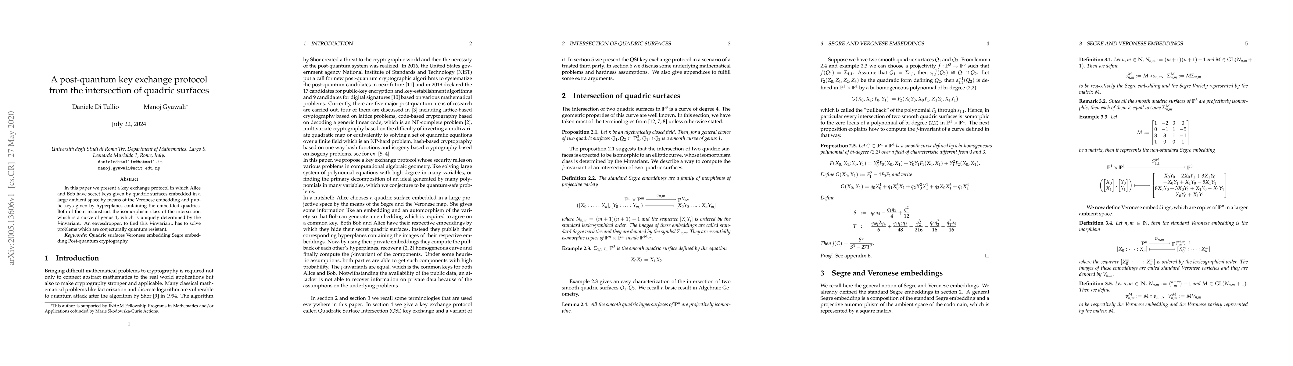 Researchers developed a post-quantum key exchange protocol using quadric surfaces, which requires solving problems conjecturally resistant to quantum computing, ensuring secure communication.