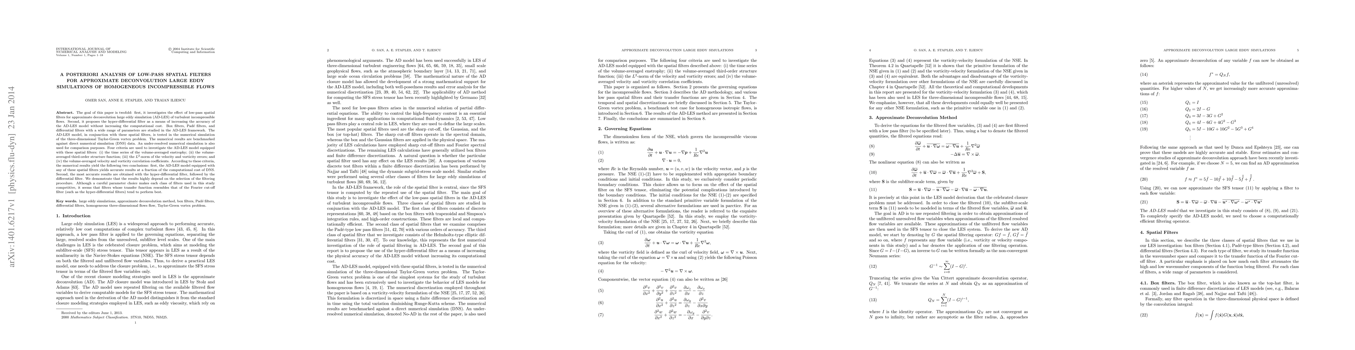 The goal of this paper is twofold: first, it investigates the effect of low-pass spatial filters for approximate deconvolution large eddy simulation (AD-LES) of turbulent incompressible flows. Second, it proposes the hyper-differential filter as a means of increasing the accuracy of the AD-LES model without increasing the computational cost. Box filters, Pad\'{e} filters, and differential filters with a wide range of parameters are studied in the AD-LES framework. The AD-LES model, in conjunction with these spatial filters, is tested in the numerical simulation of the three-dimensional Taylor-Green vortex problem. The numerical results are benchmarked against direct numerical simulation (DNS) data. An under-resolved numerical simulation is also used for comparison purposes. Four criteria are used to investigate the AD-LES model equipped with these spatial filters: (i) the time series of the volume-averaged enstrophy; (ii) the volume-averaged third-order structure function; (iii) the $L^2$-norm of the velocity and vorticity errors; and (iv) the volume-averaged velocity and vorticity correlation coefficients. According to these criteria, the numerical results yield the following two conclusions: first, the AD-LES model equipped with any of these spatial filters yields accurate results at a fraction of the computational cost of DNS. Second, the most accurate results are obtained with the hyper-differential filter, followed by the differential filter. We demonstrate that the results highly depend on the selection of the filtering procedure. Although a careful parameter choice makes each class of filters used in this study competitive, it seems that filters whose transfer function resembles that of the Fourier cut-off filter (such as the hyper-differential filters) tend to perform best.