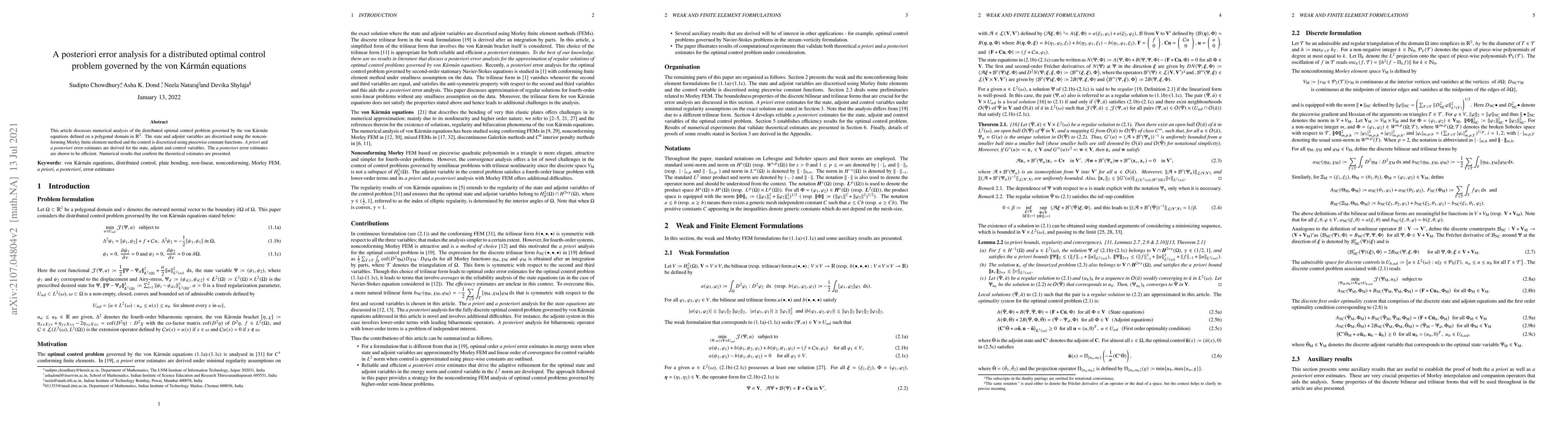 This paper presents an a posteriori error analysis for a distributed optimal control problem governed by the von Kármán equations, employing the nonconforming Morley finite element method for discretization. The study derives both a priori and a posteriori error estimates, demonstrating the efficiency of the latter, and validates the theoretical estimates with numerical results.
