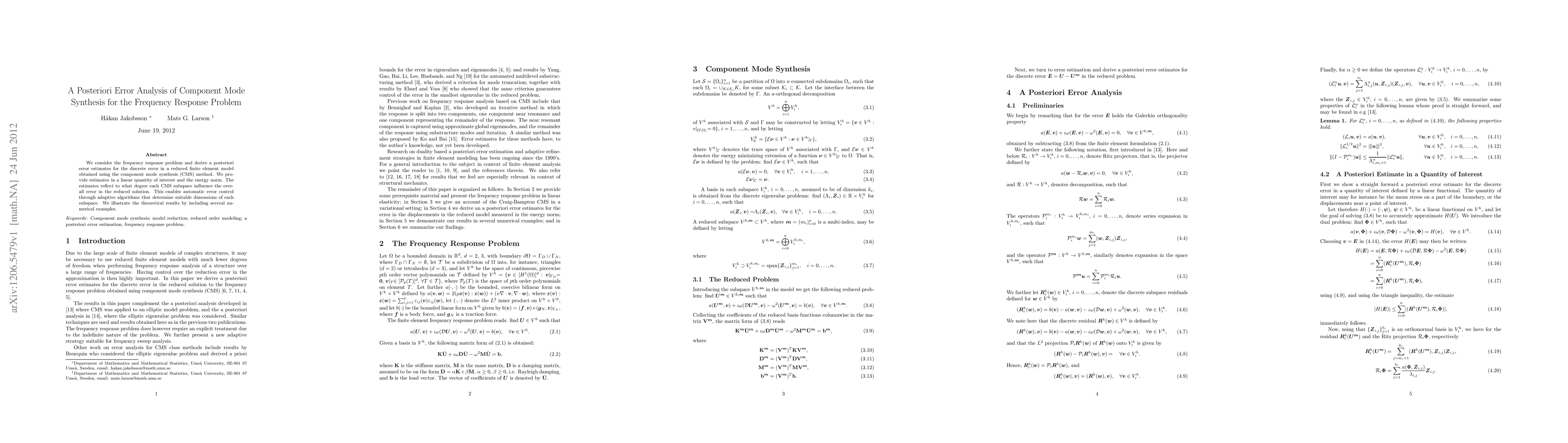 We consider the frequency response problem and derive a posteriori error estimates for the discrete error in a reduced finite element model obtained using the component mode synthesis (CMS) method. We provide estimates in a linear quantity of interest and the energy norm. The estimates reflect to what degree each CMS subspace influence the overall error in the reduced solution. This enables automatic error control through adaptive algorithms that determine suitable dimensions of each subspace. We illustrate the theoretical results by including several numerical examples.