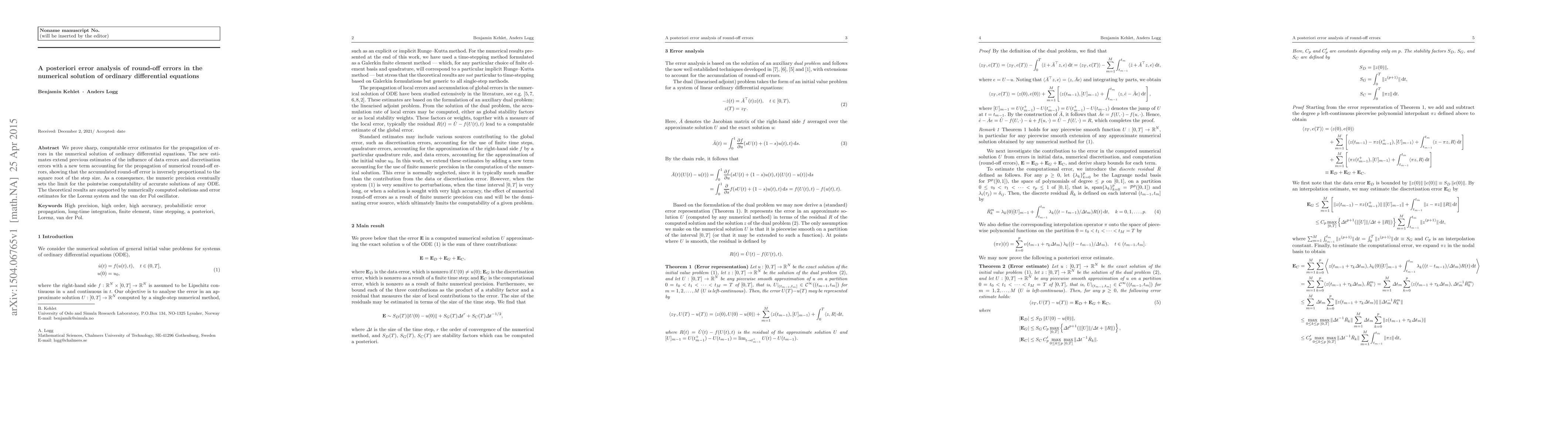 This paper provides sharp, computable error estimates for numerical round-off errors in solving ordinary differential equations, showing that these errors are inversely proportional to the square root of the step size. The study also demonstrates the theoretical results with numerical solutions for the Lorenz system and the van der Pol oscillator.