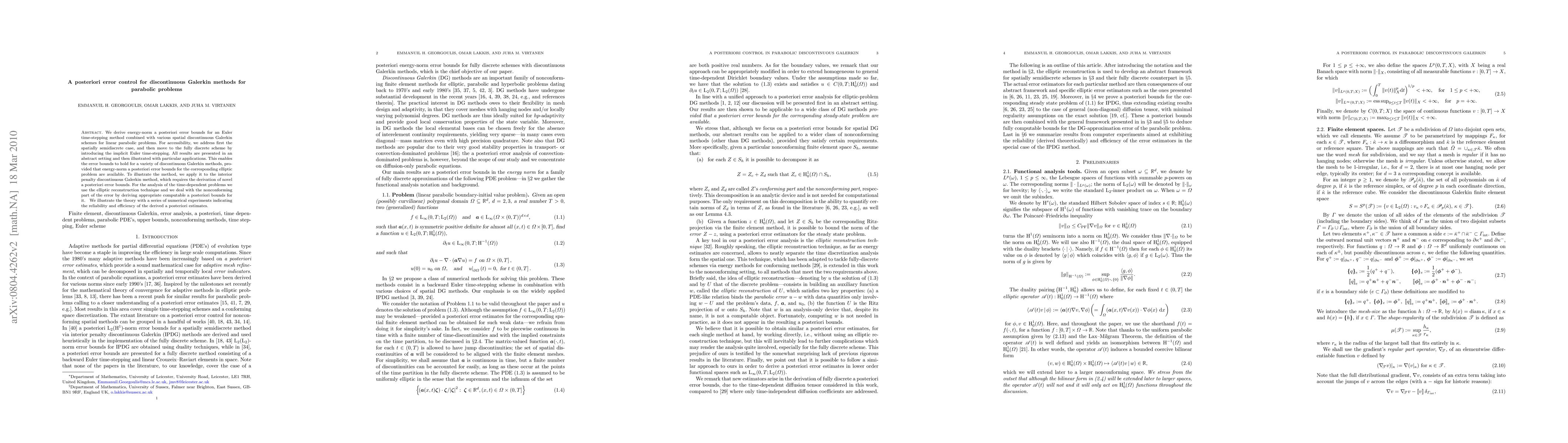 This paper develops energy-norm a posteriori error bounds for discontinuous Galerkin methods coupled with implicit Euler time-stepping for linear parabolic problems, demonstrating applicability through the interior penalty discontinuous Galerkin method with novel derived error bounds. The method uses elliptic reconstruction and addresses nonconforming error parts.