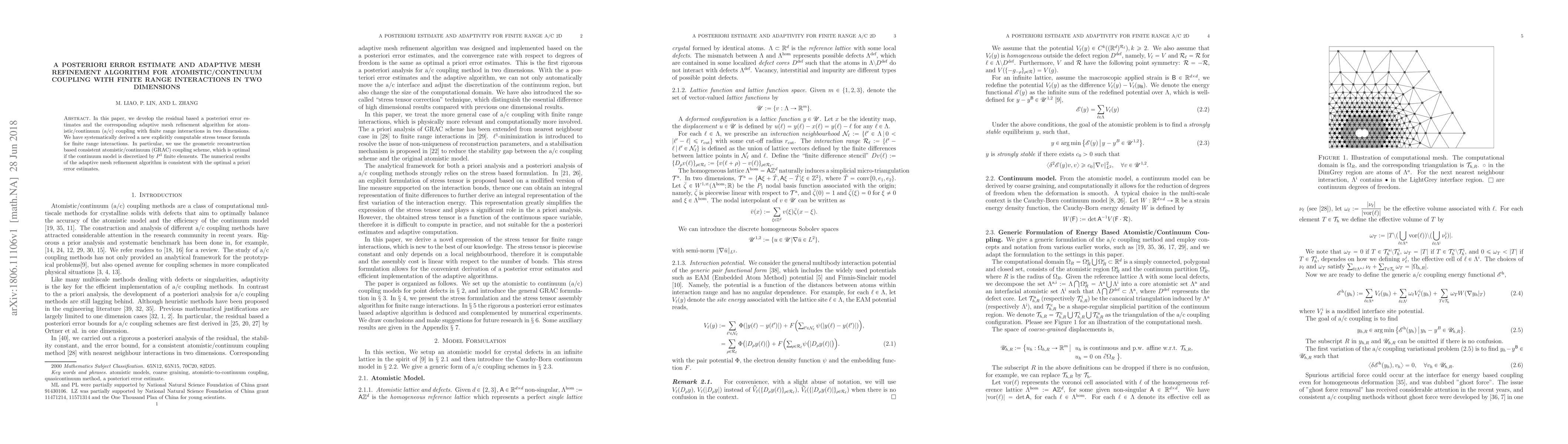 In this paper, we develop the residual based a posteriori error estimates and the corresponding adaptive mesh refinement algorithm for atomistic/continuum (a/c) coupling with finite range interactions in two dimensions. We have systematically derived a new explicitly computable stress tensor formula for finite range interactions. In particular, we use the geometric reconstruction based consistent atomistic/continuum (GRAC) coupling scheme, which is optimal if the continuum model is discretized by $P^1$ finite elements. The numerical results of the adaptive mesh refinement algorithm is consistent with the optimal a priori error estimates.