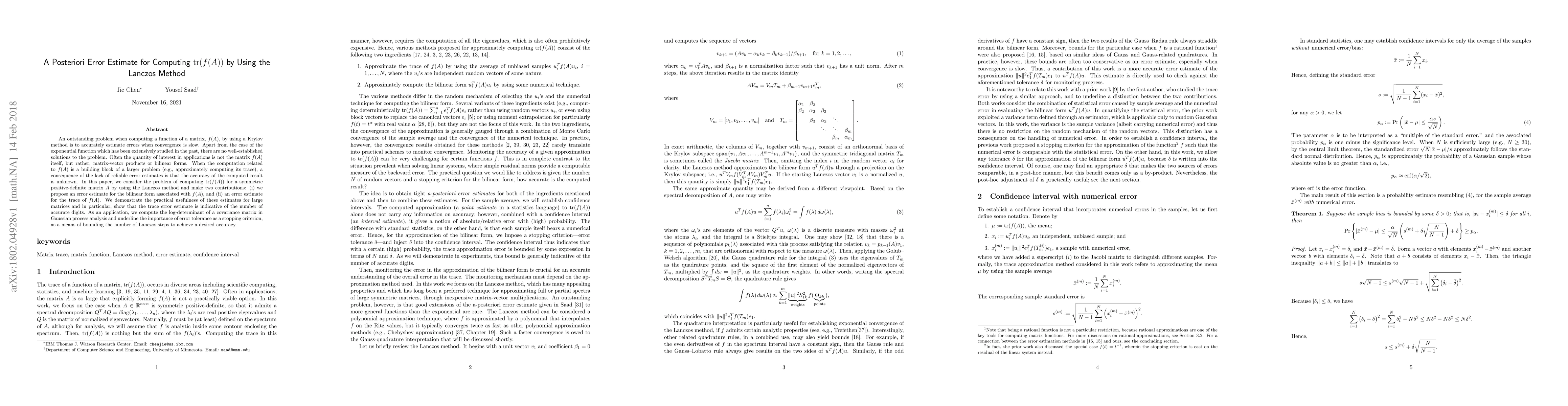An outstanding problem when computing a function of a matrix, $f(A)$, by using a Krylov method is to accurately estimate errors when convergence is slow. Apart from the case of the exponential function which has been extensively studied in the past, there are no well-established solutions to the problem. Often the quantity of interest in applications is not the matrix $f(A)$ itself, but rather, matrix-vector products or bilinear forms. When the computation related to $f(A)$ is a building block of a larger problem (e.g., approximately computing its trace), a consequence of the lack of reliable error estimates is that the accuracy of the computed result is unknown. In this paper, we consider the problem of computing $\mathrm{tr}(f(A))$ for a symmetric positive-definite matrix $A$ by using the Lanczos method and make two contributions: (i) we propose an error estimate for the bilinear form associated with $f(A)$, and (ii) an error estimate for the trace of $f(A)$. We demonstrate the practical usefulness of these estimates for large matrices and in particular, show that the trace error estimate is indicative of the number of accurate digits. As an application, we compute the log-determinant of a covariance matrix in Gaussian process analysis and underline the importance of error tolerance as a stopping criterion, as a means of bounding the number of Lanczos steps to achieve a desired accuracy.