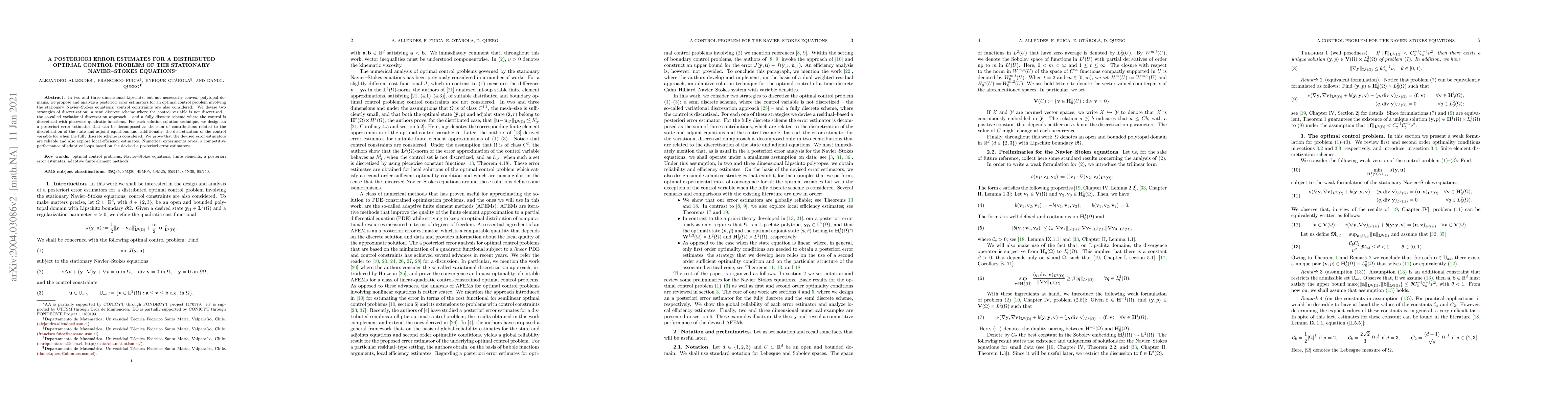 In two and three dimensional Lipschitz, but not necessarily convex, polytopal domains, we propose and analyze a posteriori error estimators for an optimal control problem involving the stationary Navier--Stokes equations; control constraints are also considered. We devise two strategies of discretization: a semi discrete scheme where the control variable is not discretized -- the so-called variational discrezation approach -- and a fully discrete scheme where the control is discretized with piecewise quadratic functions. For each solution solution technique, we design an a posteriori error estimator that can be decomposed as the sum of contributions related to the discretization of the state and adjoint equations and, additionally, the discretization of the control variable for when the fully discrete scheme is considered. We prove that the devised error estimators are reliable and also explore local efficiency estimates. Numerical experiments reveal a competitive performance of adaptive loops based on the devised a posteriori error estimators.