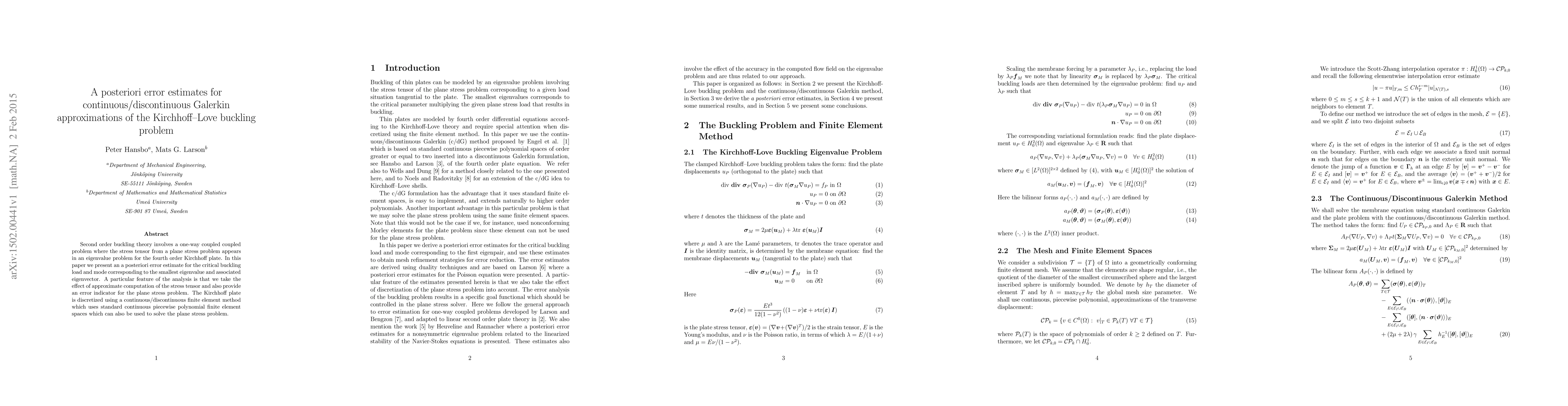 Second order buckling theory involves a one-way coupled coupled problem where the stress tensor from a plane stress problem appears in an eigenvalue problem for the fourth order Kirchhoff plate. In this paper we present an a posteriori error estimate for the critical buckling load and mode corresponding to the smallest eigenvalue and associated eigenvector. A particular feature of the analysis is that we take the effect of approximate computation of the stress tensor and also provide an error indicator for the plane stress problem. The Kirchhoff plate is discretized using a continuous/discontinuous finite element method which uses standard continuous piecewise polynomial finite element spaces which can also be used to solve the plane stress problem.