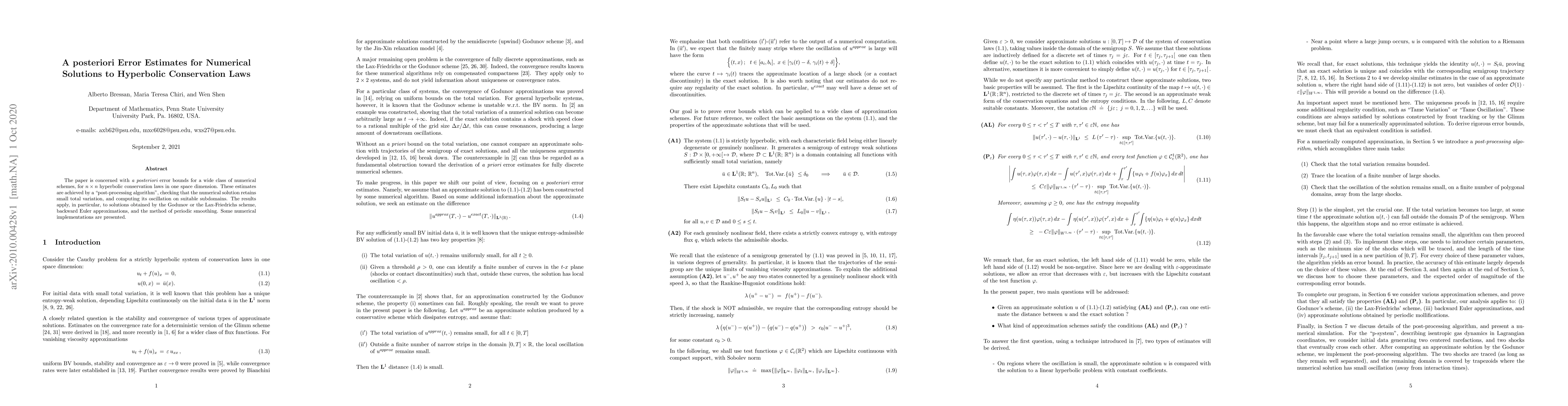 The paper develops a posteriori error estimates for numerical solutions to one-dimensional hyperbolic conservation laws using a post-processing algorithm that checks for small total variation and computes the oscillation on suitable subdomains. The results apply to solutions obtained by various schemes, including Godunov, Lax-Friedrichs, backward Euler, and periodic smoothing methods.