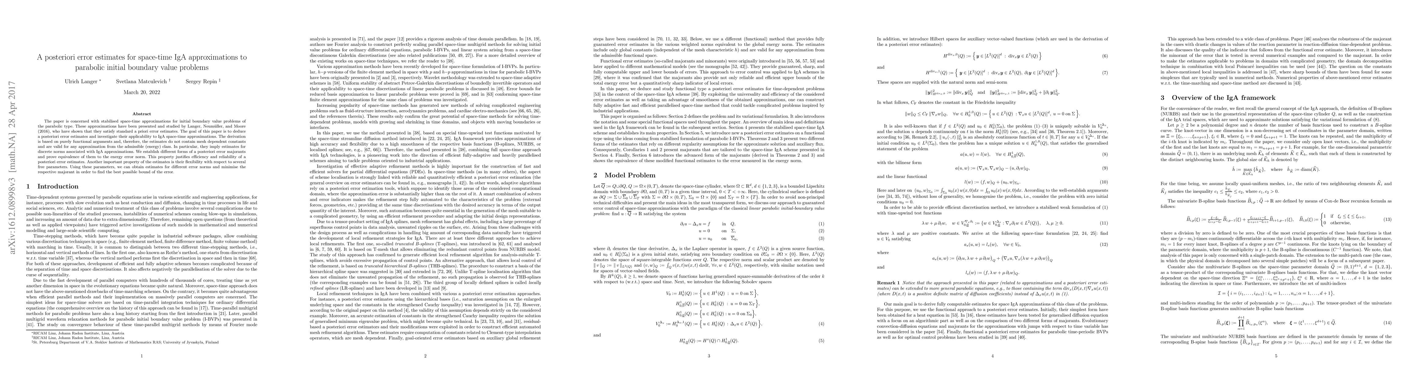 This paper develops a posteriori error estimates for space-time IGA approximations to parabolic initial boundary value problems, proving their equivalence to the energy error norm and flexibility in handling various error norms. The estimates are derived without mesh-dependent constants and apply to a broad class of approximations.
