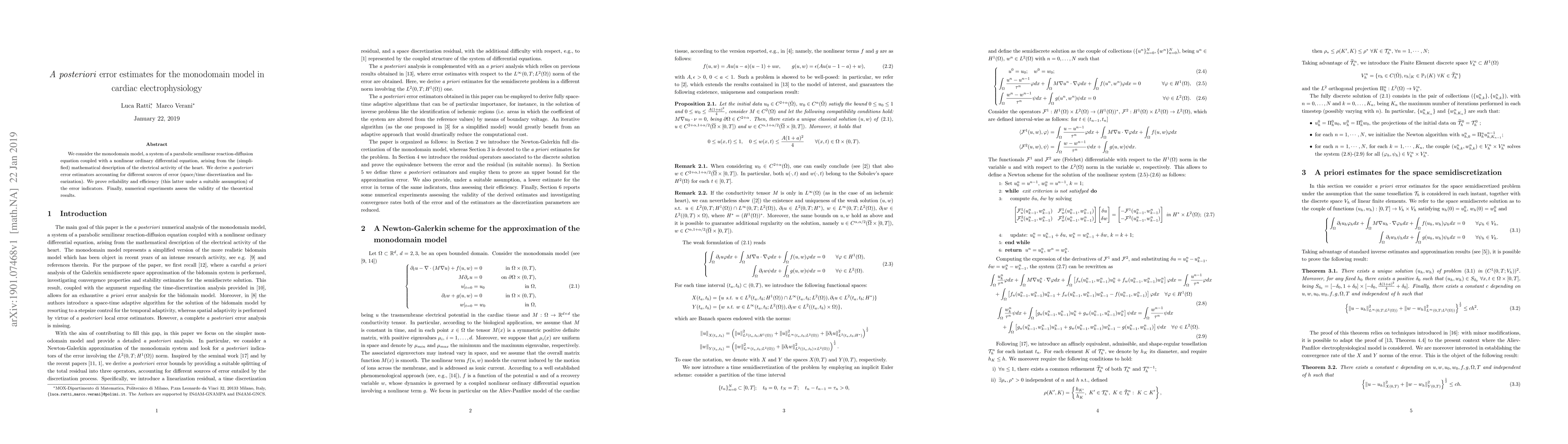 We consider the monodomain model, a system of a parabolic semilinear reaction-diffusion equation coupled with a nonlinear ordinary differential equation, arising from the (simplified) mathematical description of the electrical activity of the heart. We derive a posteriori error estimators accounting for different sources of error (space/time discretization and linearization). We prove reliability and efficiency (this latter under a suitable assumption) of the error indicators. Finally, numerical experiments assess the validity of the theoretical results.