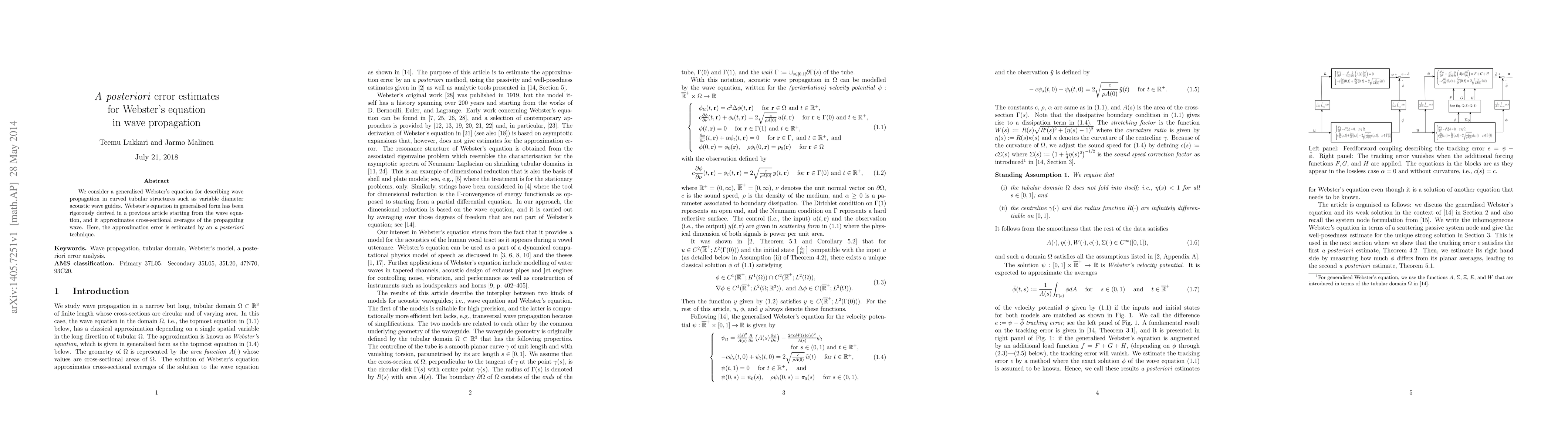 We consider a generalised Webster's equation for describing wave propagation in curved tubular structures such as variable diameter acoustic wave guides. Webster's equation in generalised form has been rigorously derived in a previous article starting from the wave equation, and it approximates cross-sectional averages of the propagating wave. Here, the approximation error is estimated by an a posteriori technique.