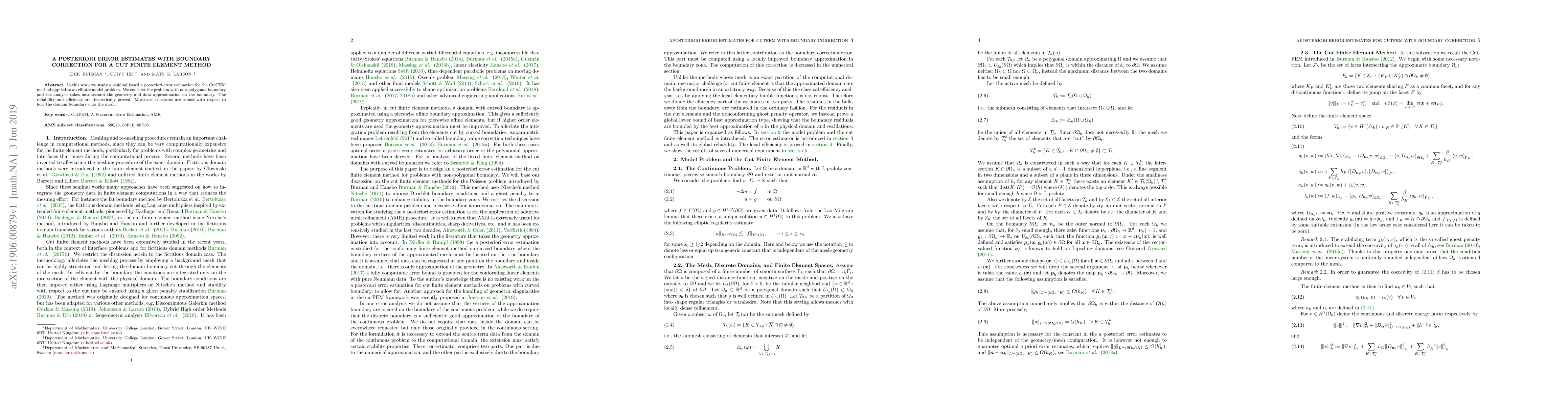 This paper develops a residual-based a posteriori error estimate for the CutFEM method applied to elliptic problems with non-polygonal boundaries, proving its reliability and efficiency while ensuring robust constants regardless of mesh cutting.