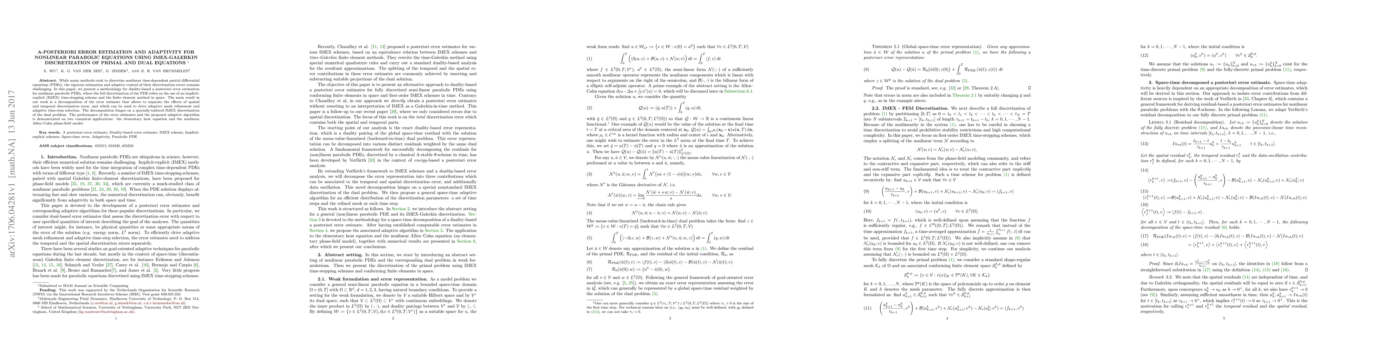 This paper introduces a novel methodology for a posteriori error estimation and adaptivity in nonlinear parabolic PDEs using IMEX-Galerkin discretization. The method decomposes the error into spatial and temporal components, enabling adaptive mesh refinement and time-step selection, and is demonstrated on the heat equation and Allen-Cahn model.