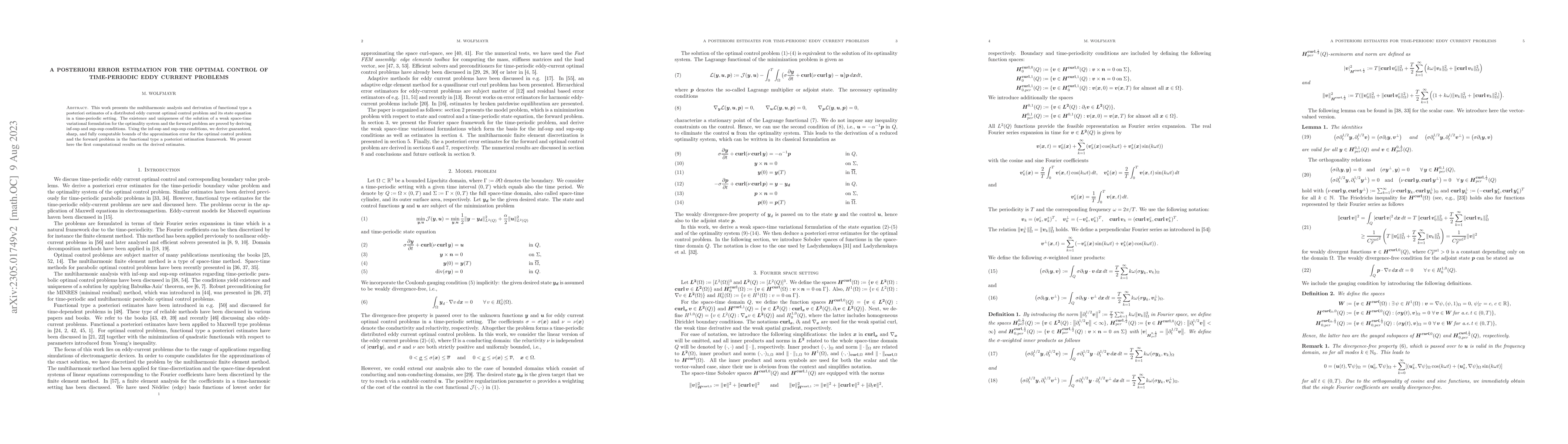 This paper develops a posteriori error estimates for the optimal control of time-periodic eddy current problems, proving the existence and uniqueness of solutions through inf-sup and sup-sup conditions. It provides sharp, computable bounds for both the control and state equations, and presents initial computational results.
