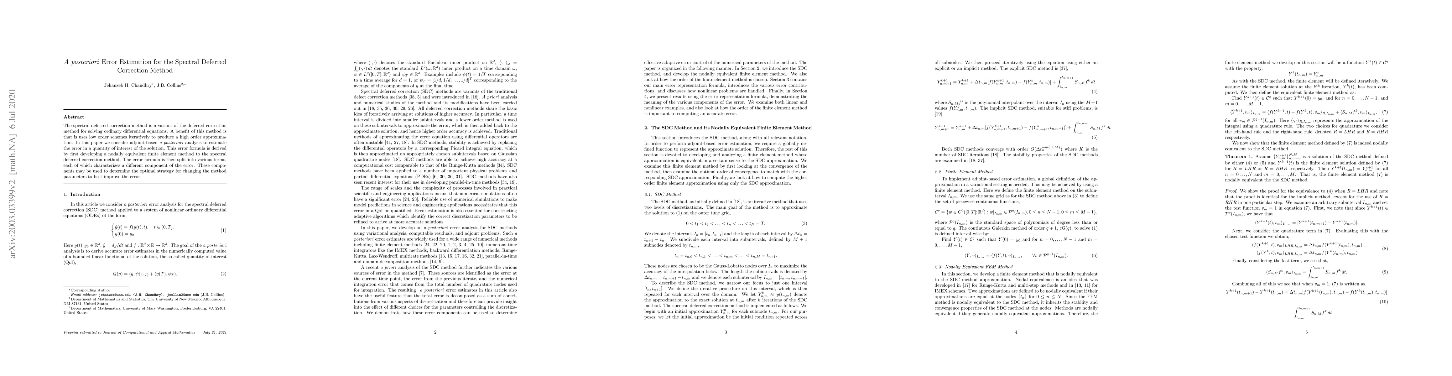 This paper develops an adjoint-based a posteriori error estimation for the spectral deferred correction method to solve ordinary differential equations, deriving a nodally equivalent finite element method and splitting the error formula into components to guide optimal parameter adjustments.